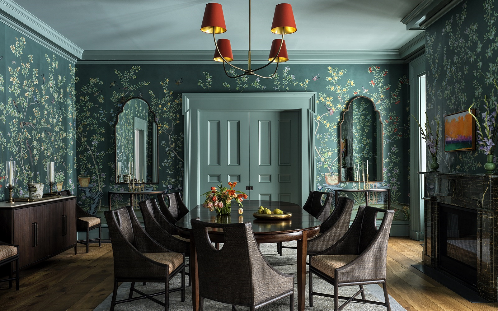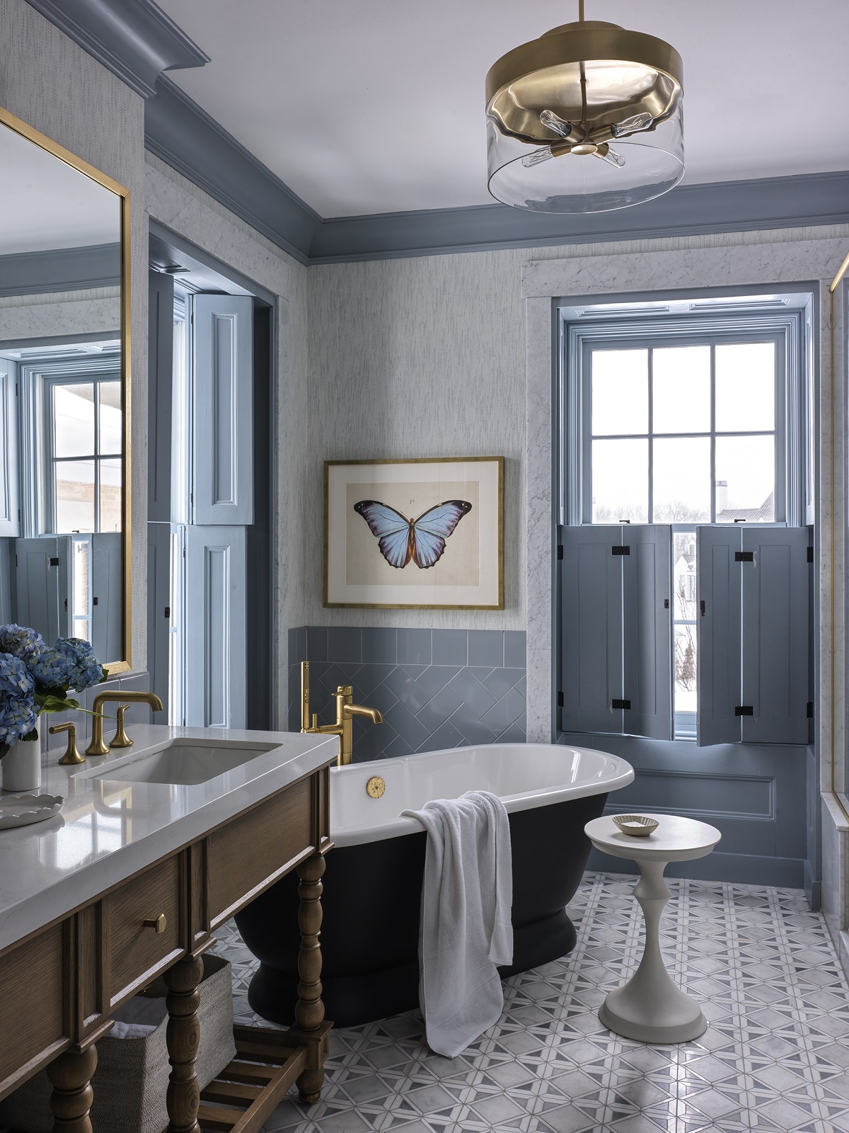 Inside the historic home, the front-facing parlors, dining room, and study retain their original layout. These rooms are layered with rich colors, custom wall coverings, and selections from an extraordinary collection of American art. The four suites within the Farmhouse are the most expansive rooms in the Inns of Aurora portfolio, featuring five-fixture baths, walk-in closets, and preserved millwork. Bathrooms pair stone and tile with muted palettes of pale blue and cream, elevated with brass fixtures.