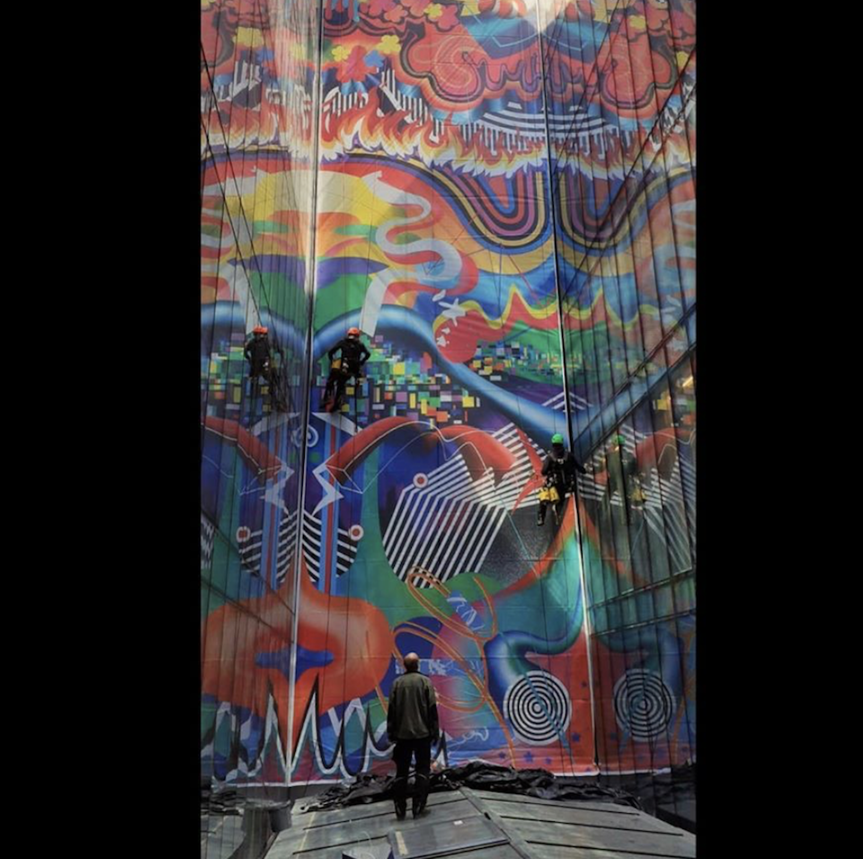 In Hard Rock Hotel Budapest, the Art Story team installed their largest artwork ever. ‘Liquid Music’ is 20m high, unashamedly loud, and runs the height of the internal atrium of the hotel. It was so large that it had to be expertly installed by abseil. Designed by in house digital artist Tegan, the statement artwork was inspired by Budapest’s local street art scene where whole building facades are painted with murals. Street artists offer an abundance of inspiration when is comes to considering art outside. They demonstrate the limitless possibilities of eye-catching artwork that durable enough to withstand the great British weather. ‘Liquid Music’ flows through the decades of popular music, from the 1950s on the 7th floor down through to the experimental digital music of today.