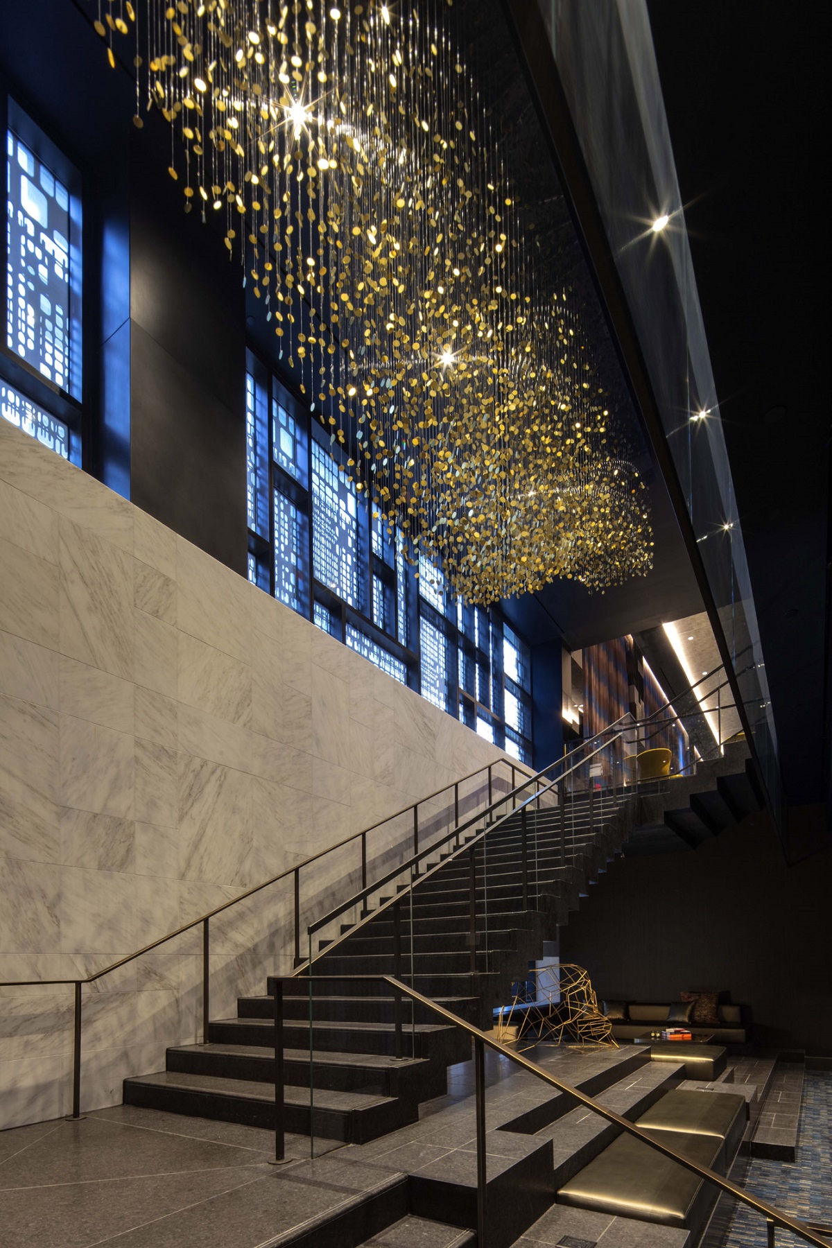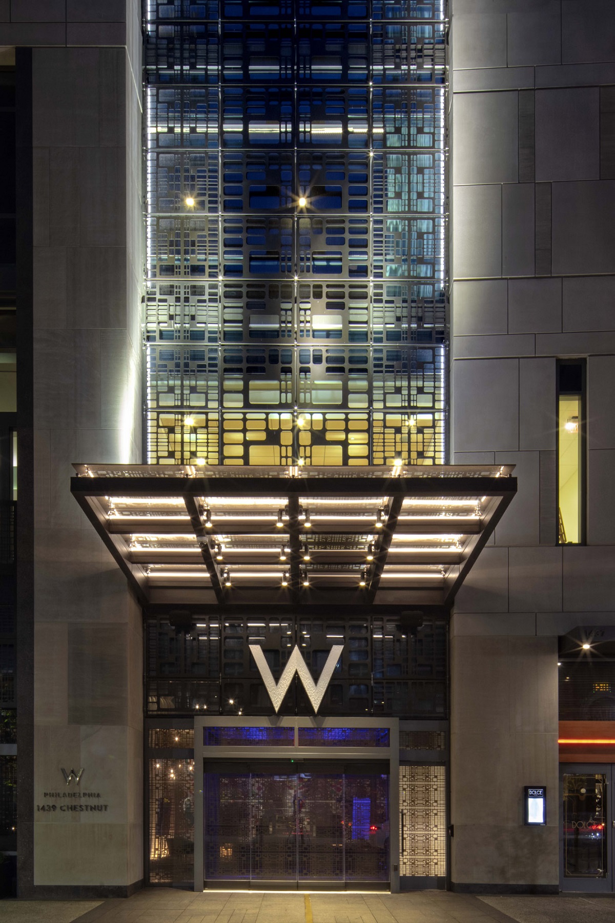 At the base of the tower is a seven-story stone and precast podium housing the public spaces showcasing the masonry and historic context of the neighbouring limestone structures. The street is lined with many uniquely designed entrances that provide a separate identity for each brand, as well as the restaurant, retail and employee entrances. The façade encompasses a mosaic of textures and patterns of stone, metal, and glass, giving tribute to the city’s diversity. They represent the layers of history and culture that are interwoven into Philadelphia’s social fabric. Paying homage to Penn’s planned city, a patterned interlayer grid is set into the glass canopy and the vestibule at the W entrance. A vertical ornamental metal screen separates the masonry base as a nod to its main entrance while simultaneously drawing your eye up to the tower above. Fortifying the historical aspect of Philadelphia, the metal grid extends into the entrance, directing guests as they approach the lobby. Once inside, guests recall the patterned grid throughout the interior, including its use as decorative screened walls and ceiling features.