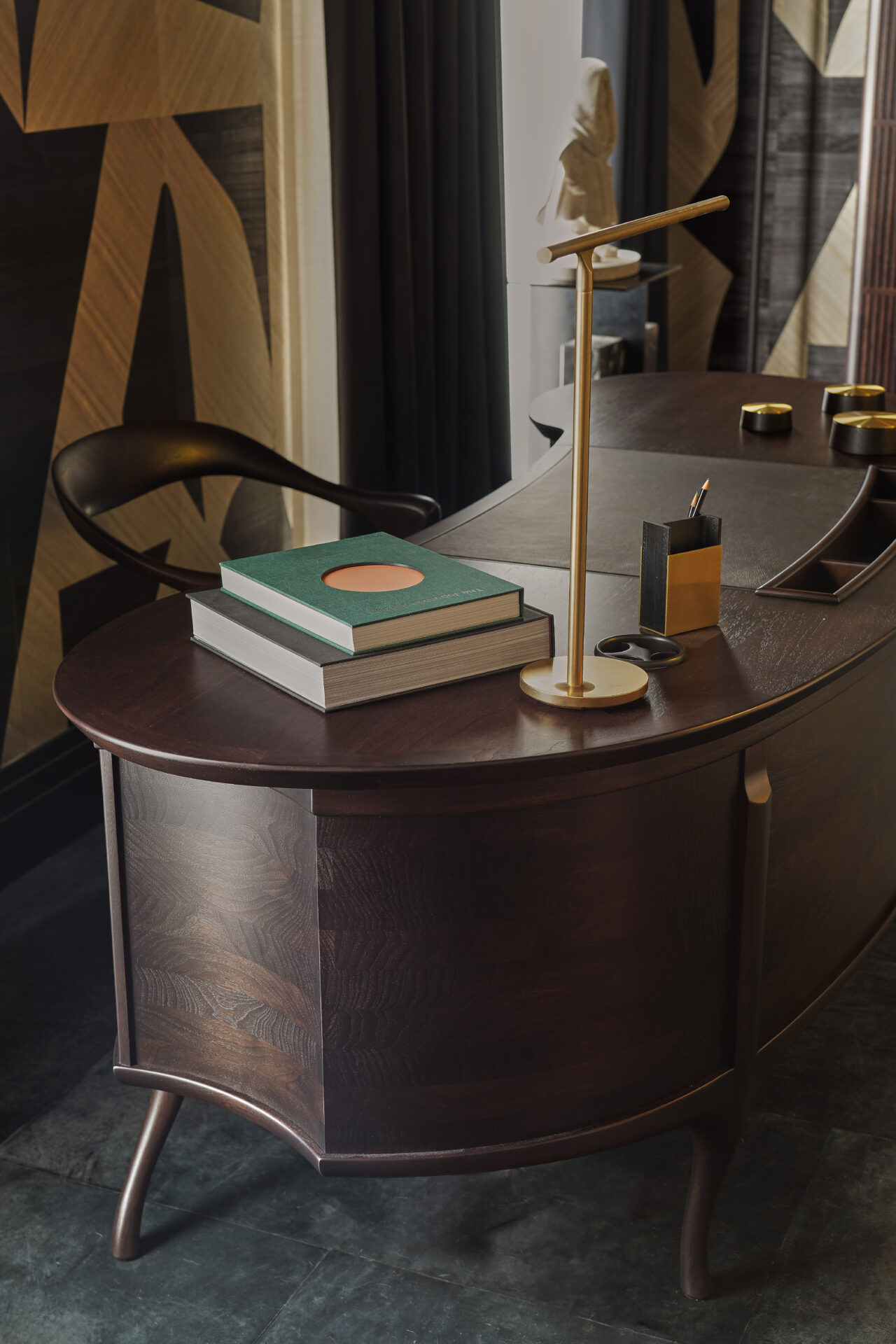 Furniture and lighting choices echo the same commitment to form and function. Nothing is superfluous, every curve and angle has been thought through. A desk doesn’t just offer surface space, it becomes a focal point with sculptural legs and a finish that subtly reflects the room’s changing light. A chair is ergonomically crafted, yet it reads as a modern art piece. The sideboard, encased in a bronze armadillo-esque armour; lighting, often the maker or the breaker of an interior design project, is used here both practically and atmospherically, casting layered glows that adapt the mood of the space throughout the day.