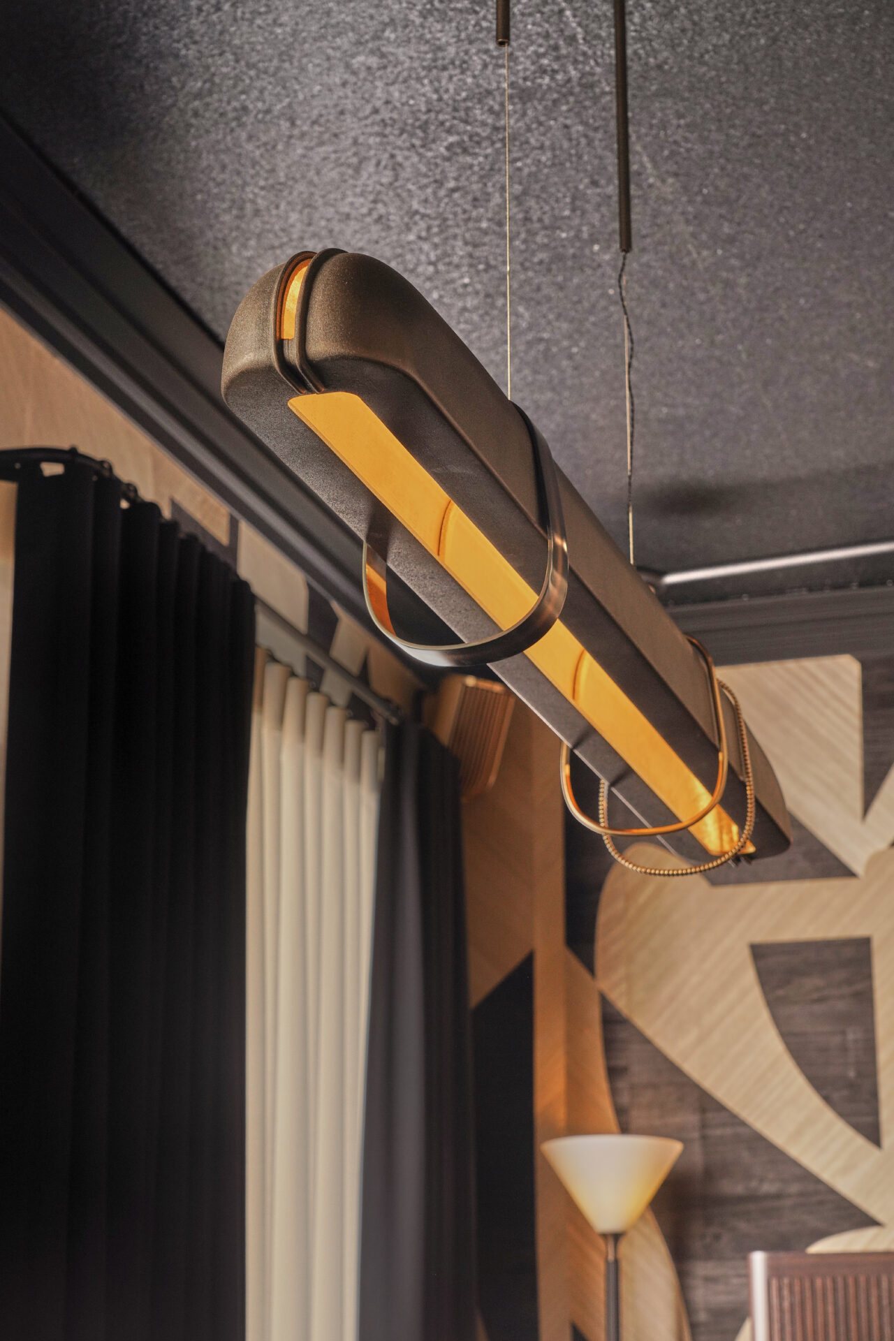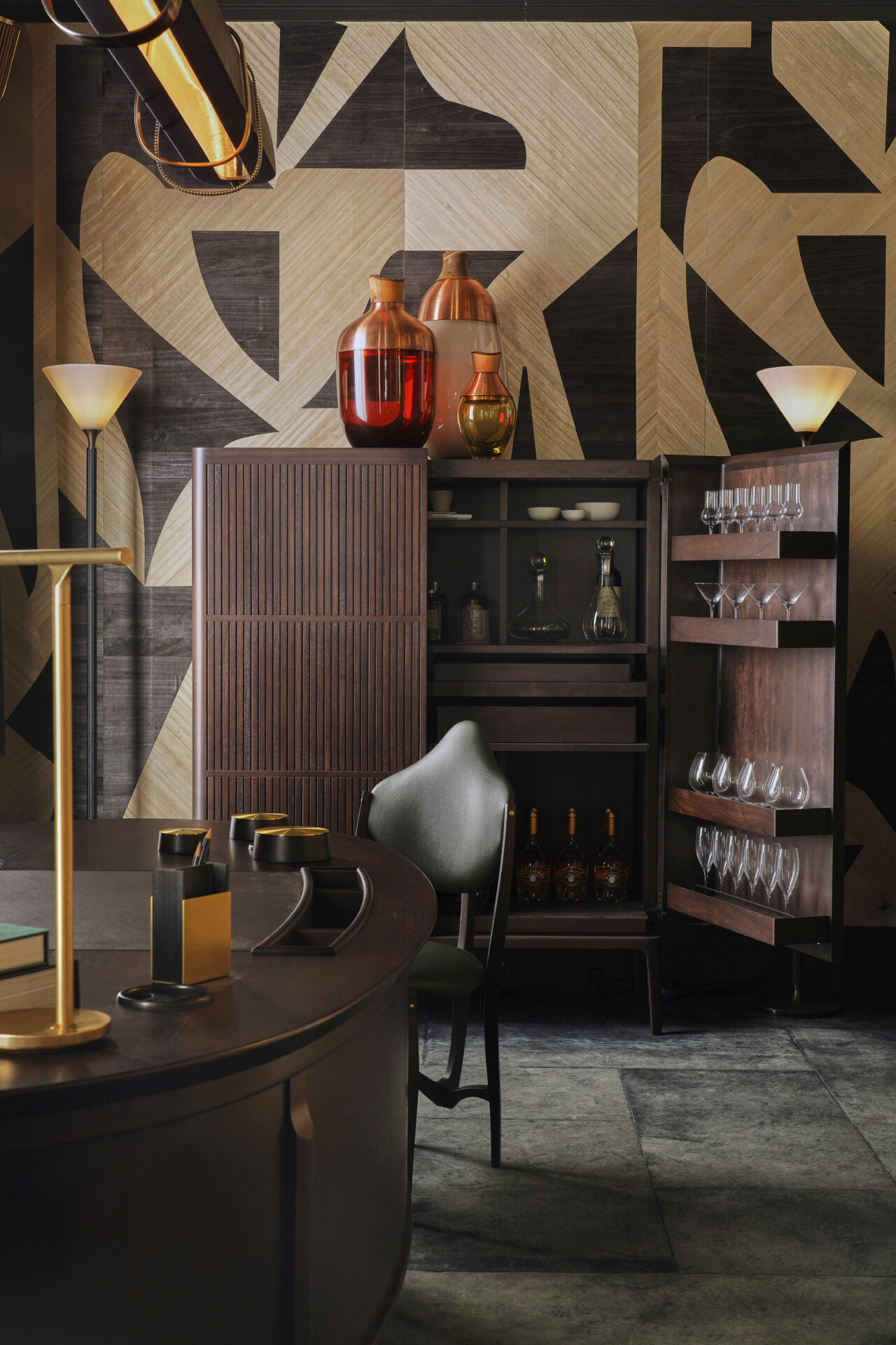 The collaboration with Phillip Jeffries wallcoverings is a fitting choice for this project. Known for bold, tactile wall finishes that transform rooms into sensory experiences, Phillip Jeffries aligns naturally with Staffan’s design ethos. The bold, contrasting, geometric wallcoverings are more than decorative, they are expressive, narrative-driven, and echo Tollgård’s background in filmmaking and his approach to design as a storytelling medium. The walls are wrapped in hand-crafted wood veneer that offers warmth and textural intrigue. While the ceiling gleams with a quartz finish, for a reflective dimension that enlightens.