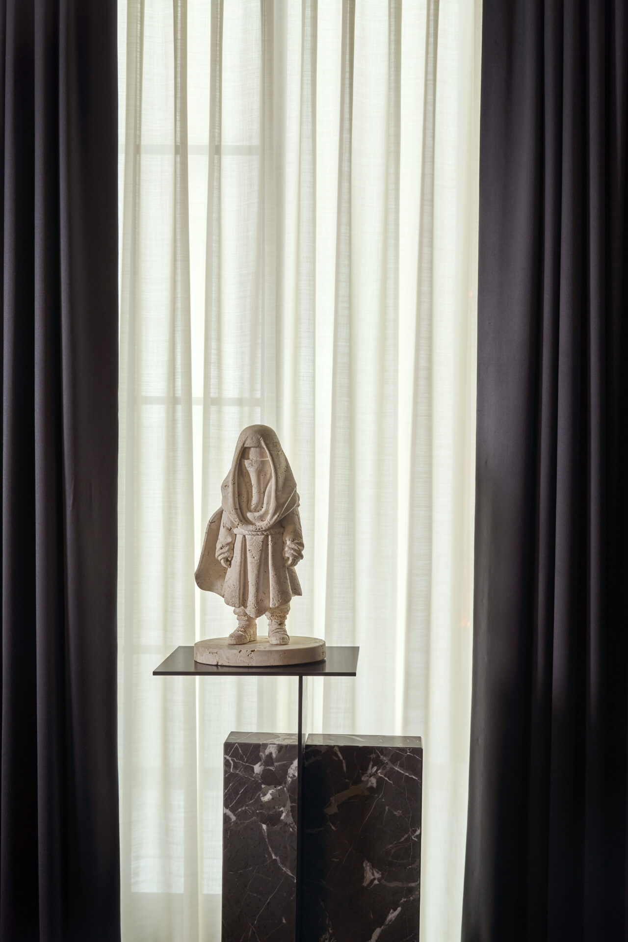 The material palette is curated with care. Organic forms dominate, rendered in natural stone, metal, glass, wood, and leather. These are not passive surfaces, they are sculptural and dynamic and invite interaction. Rather than existing in contrast, these materials harmonise – cool meets warm, rough meets smooth – creating a balanced sensorial environment. Each element is a study in duality.