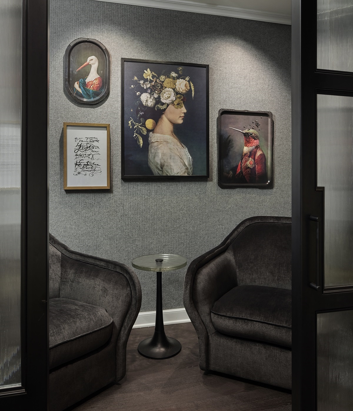 The Club Lounge offers the contrast of ebony wood flooring against crisp white walls, in addition to eye-catching green accents throughout the space. Large rugs, inspired by the texturing of natural stone, decorate the floor with garden-like, flowing shapes in shades of green, grey, and charcoal.