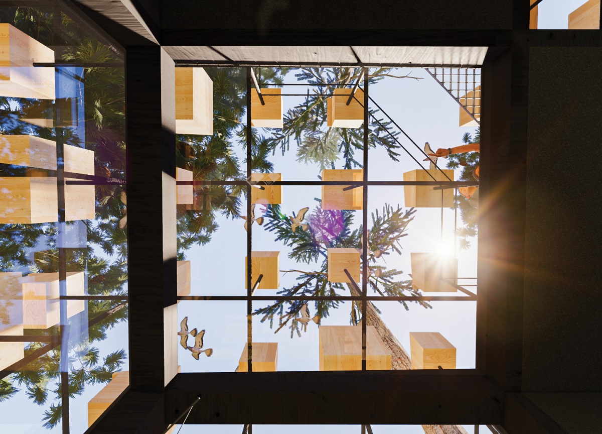 the suspended cabin covered in birdboxes is accessed via a suspended bridge