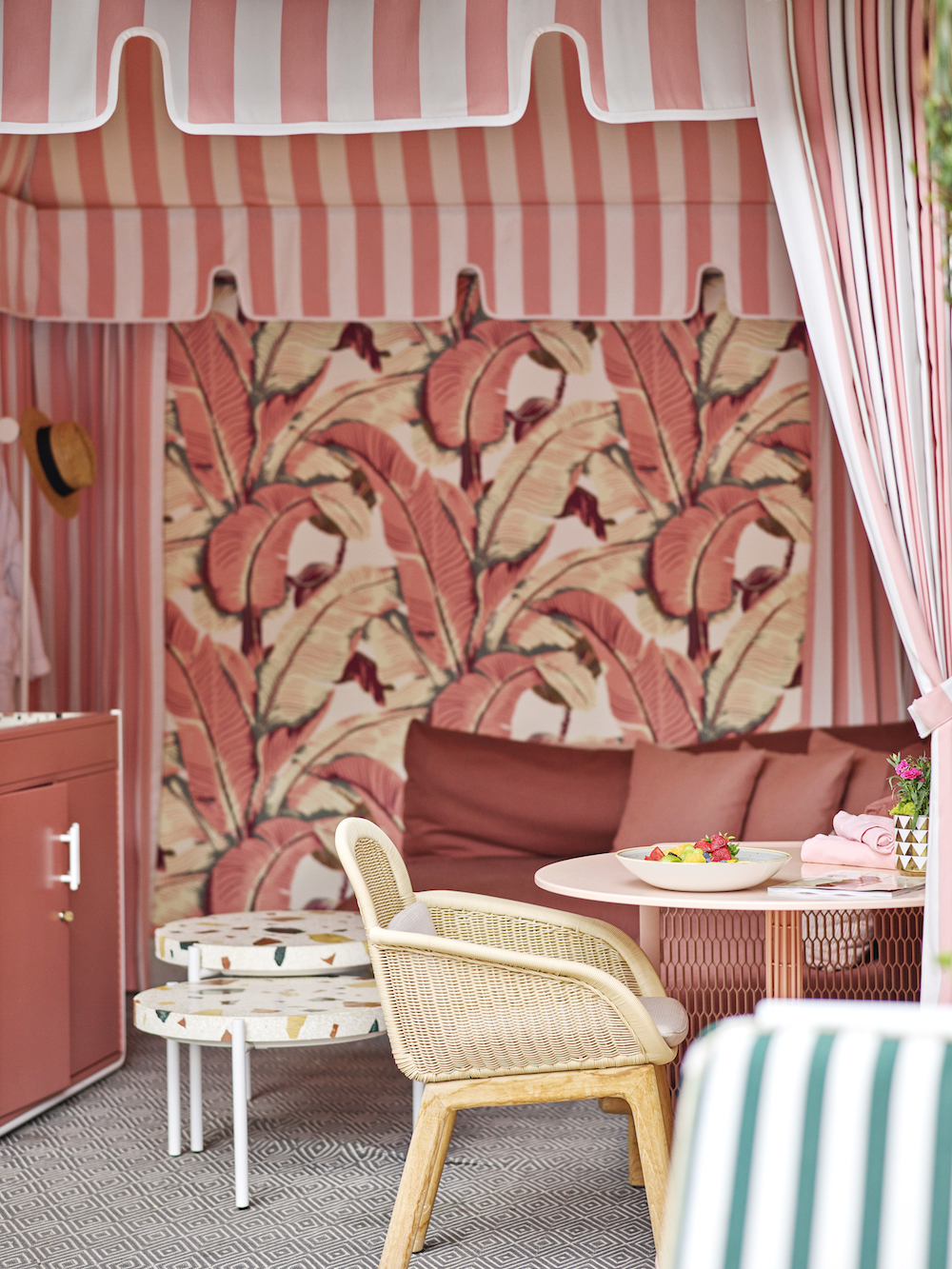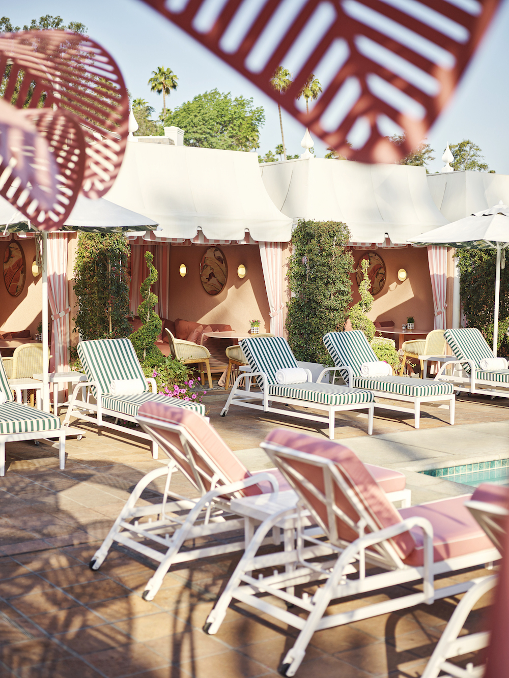 The newly refreshed cabanas convey a welcoming residential feel while paying homage to the hotel’s iconic design elements. Admiring the storied history of the hotel and pool area in particular, each space is imbued with a nostalgic sense of Hollywood glamour. The design team have created a distinct atmosphere that builds up from the details: basket weave on the chairs, terrazzo on the coffee tables, and bright candy pink throughout the space. Establishing an even deeper sense of place, the design studio had sourced beautiful peach pink tables from a local Los Angeles designer, Bend. Adorned in pink and white interior striped awnings, guests in the cabanas find themselves immersed in all the fun and exclusivity that Beverly Hills has to offer.