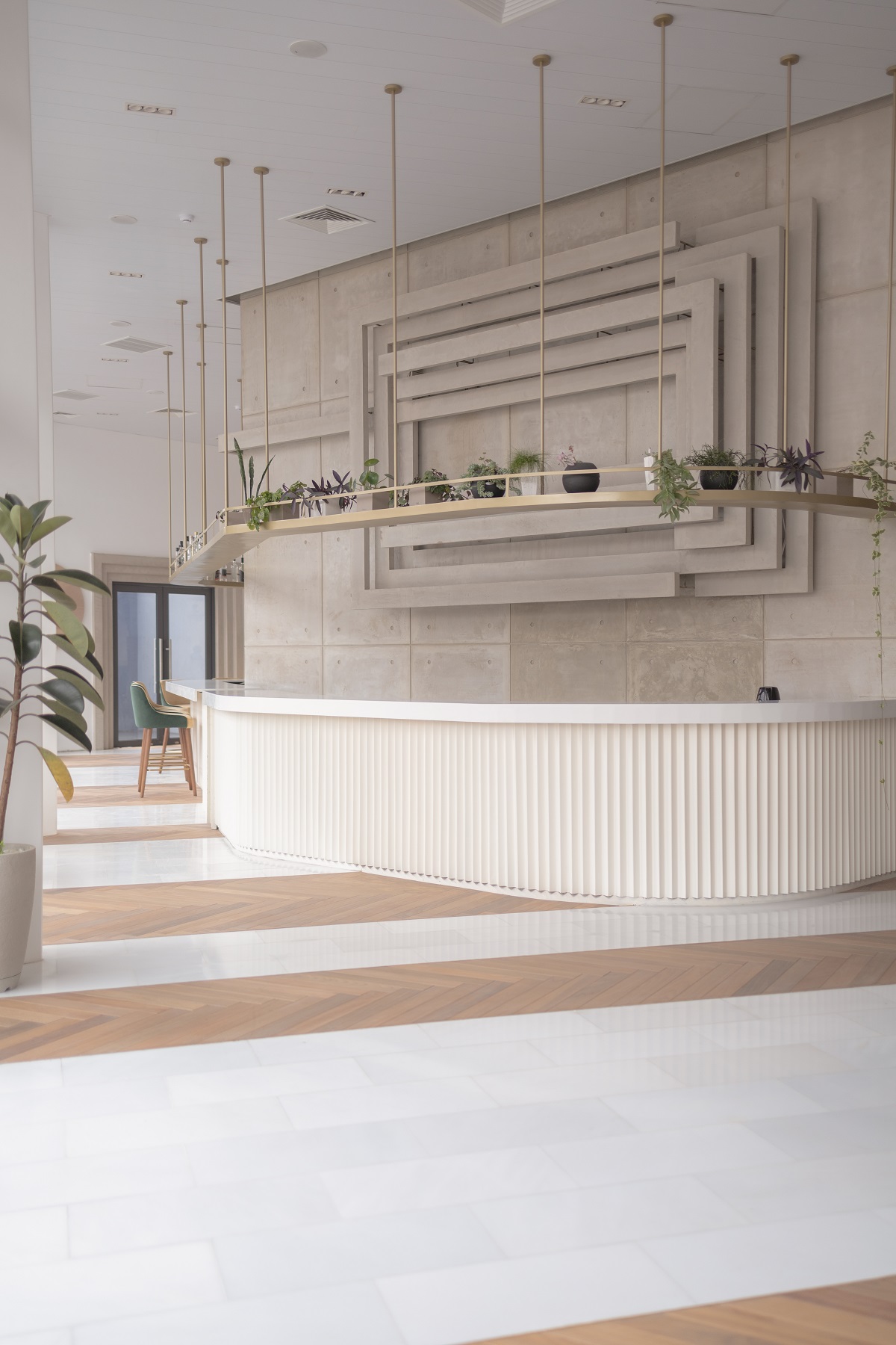 Continuing the design narrative of modern design with an emphasis on Bolivian culture, the lobby draws inspiration from the local ruins of Pumapunku and Tiwanaku with its layered concrete walls shaped like perfectly cut geometric stones. While the design is largely modern, these historically significant patterns provide underlying textures that provide a sense of place.