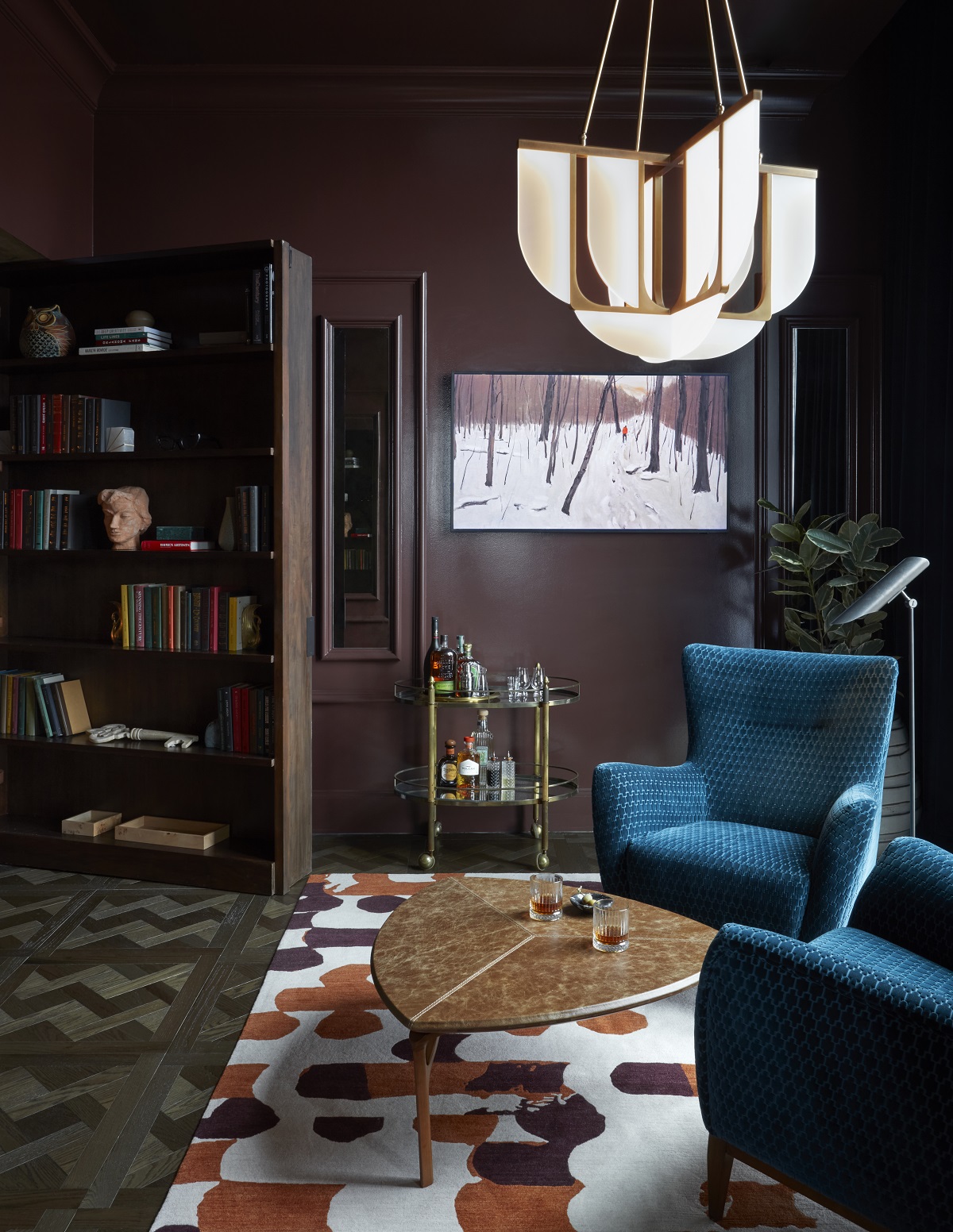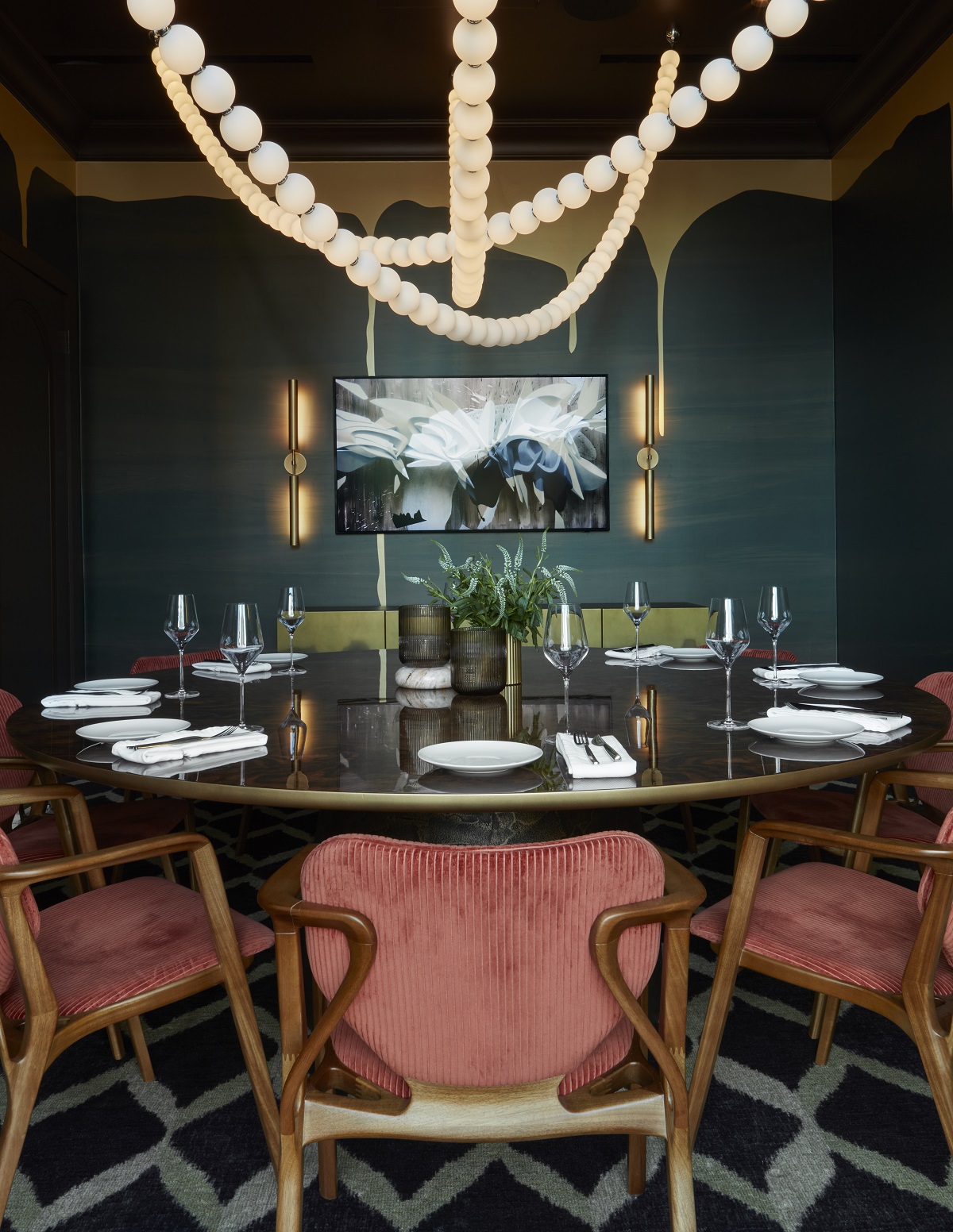The private dining rooms each tell their own story: one is immersive and vibrant with bold colours, another exudes refined elegance, while the third is wrapped in dark wall coverings with cascading gold drips and a statement Akoya pendant. The offbeat arches throughout the club soften the structured the architecture, guiding guests through the space while framing striking views.
