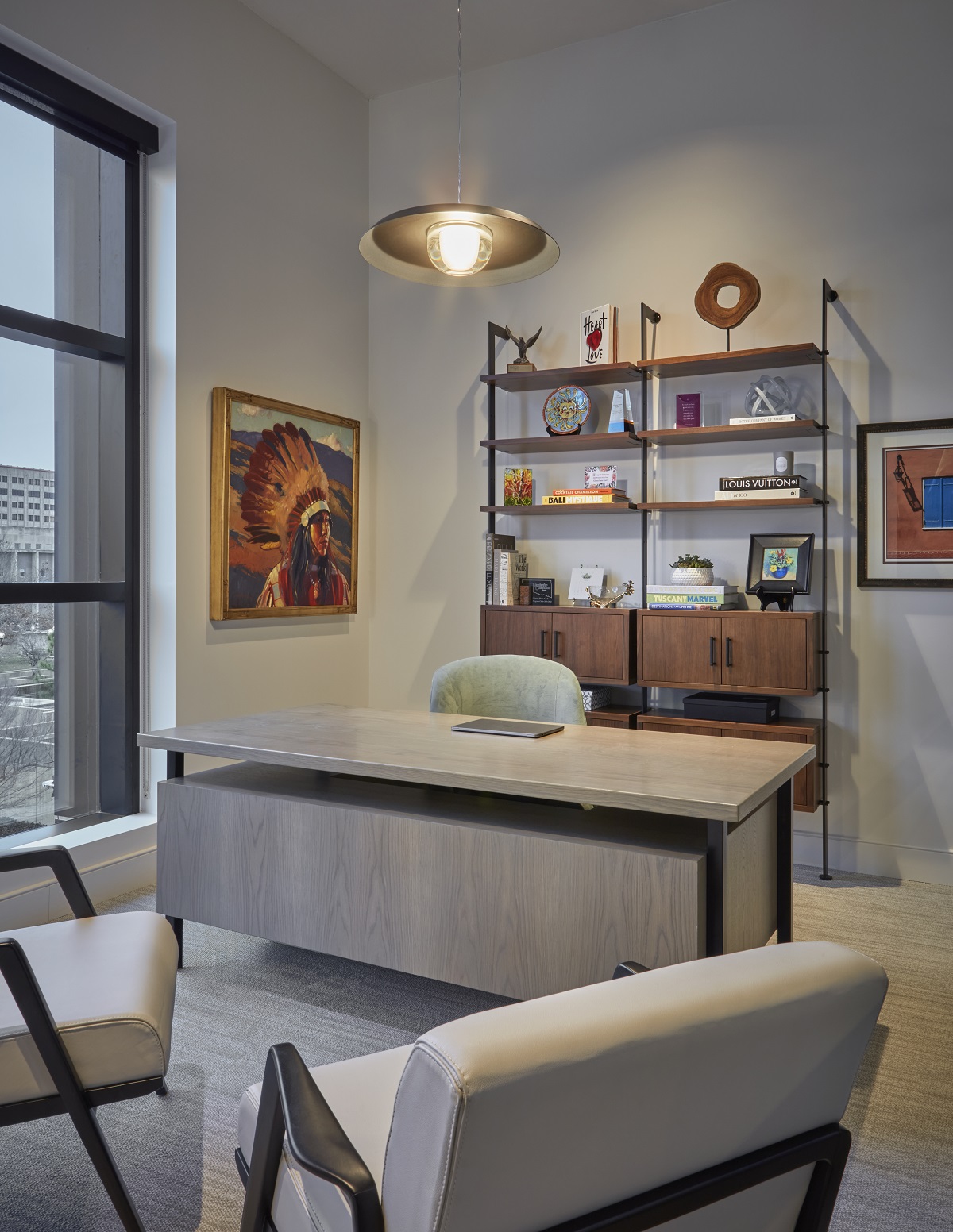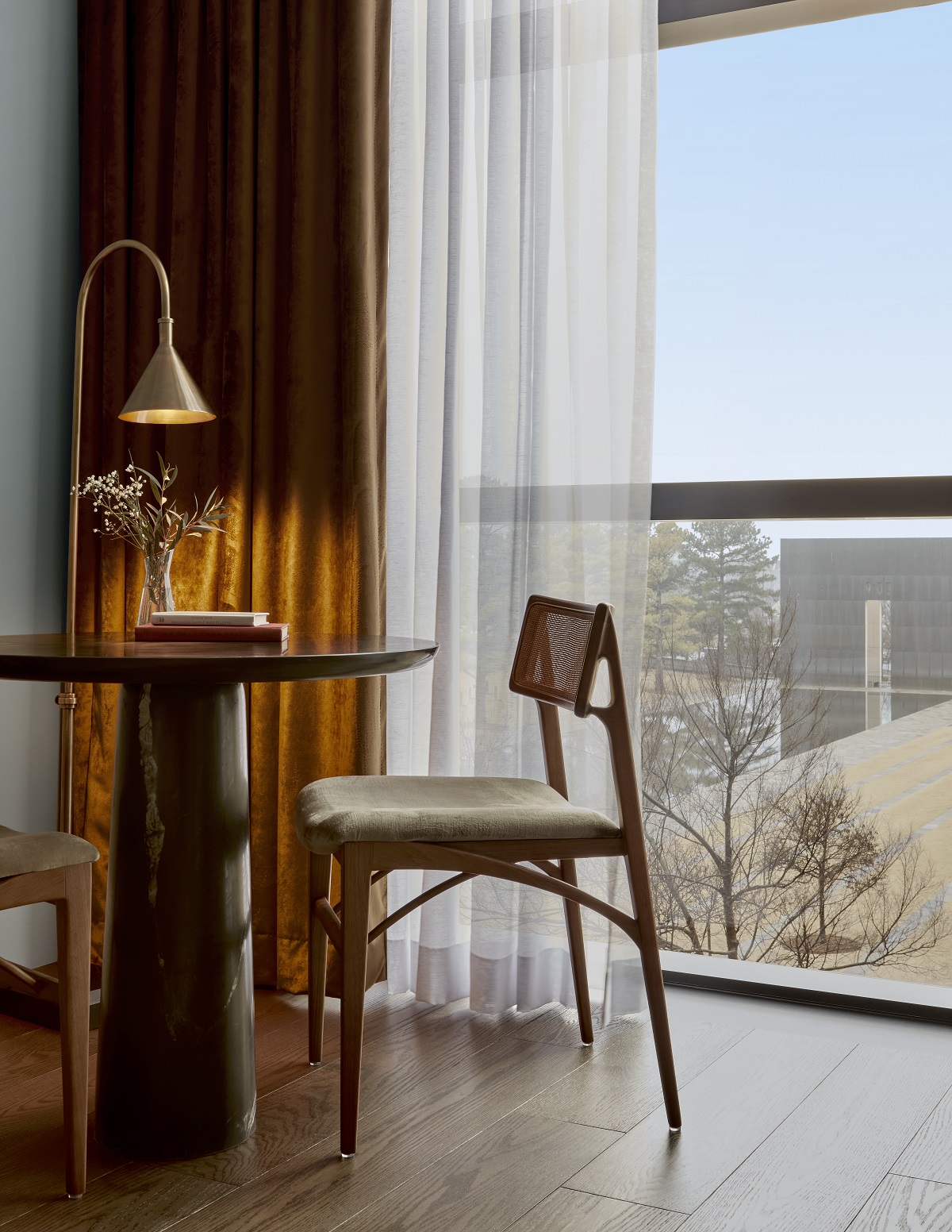 Designed for continuity, the hotel floor mirrors the club’s elegance with matching marble flooring with mahogany painted panelling. However, beyond the elevator lobby, the ambiance shifts to a curated hospitality experience, while the guest rooms embrace a more residential and intimate feel. Each of the sixteen room, including the Residence Suite, are positioned along the building’s façade, maximizing natural daylight through expansive floor-to-ceiling windows which offer uninterrupted views and historical presence of the memorial and downtown Oklahoma City.