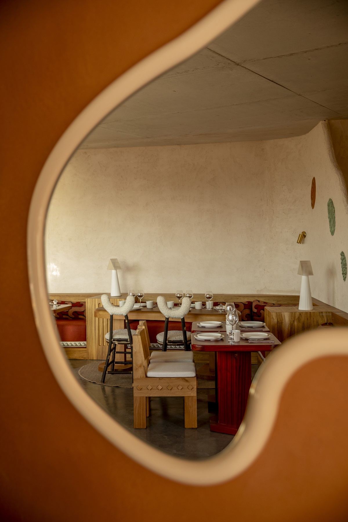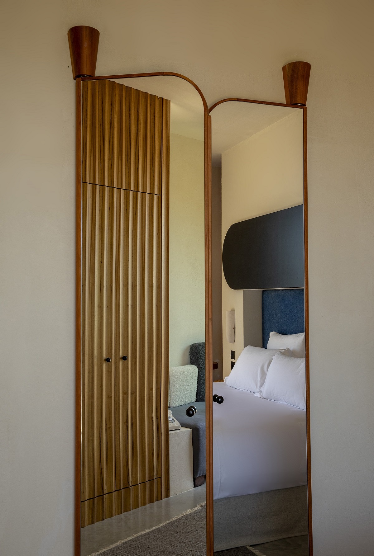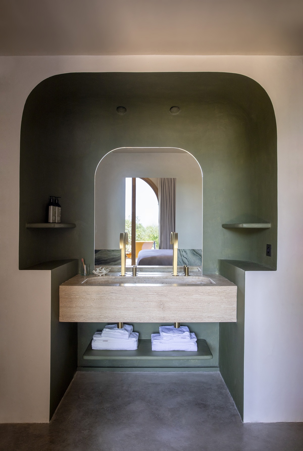 The collaboration between her design studio CHZON and Orma Architettura, was a natural fit. The idea was to bring history to life by blending sea, vegetation and land. That is the why, in these bedrooms, everything is about texture, nothing is smooth, the natural materials are foregrounded with, in places, the sudden appearance of the rock itself. This is a story of the Mediterranean, one that makes several subtle references to Greek mythology: columns and alcoves here, bathrooms with classical architecture and friezes etched into the plaster there.