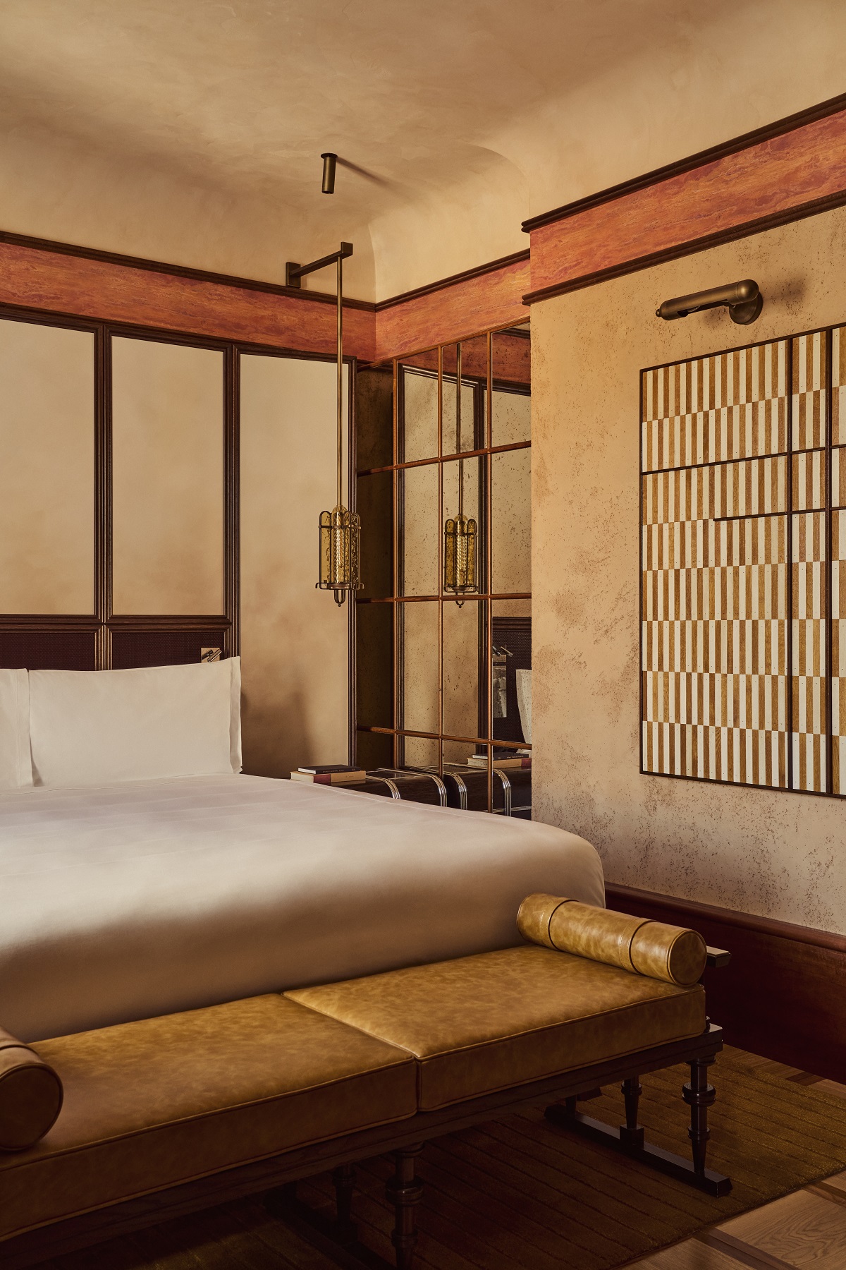 Hugo Toro conjures the imagery of an ideal journey, inviting guests into the home of a refined aesthete gently transformed into a hotel. A masterful interplay of textures, tones, and light reveals itself in every detail. Temporal and stylistic references ripple throughout the space, animating it with quiet complexity, such as the hand-painted evocation of Rome’s sky above each bed.