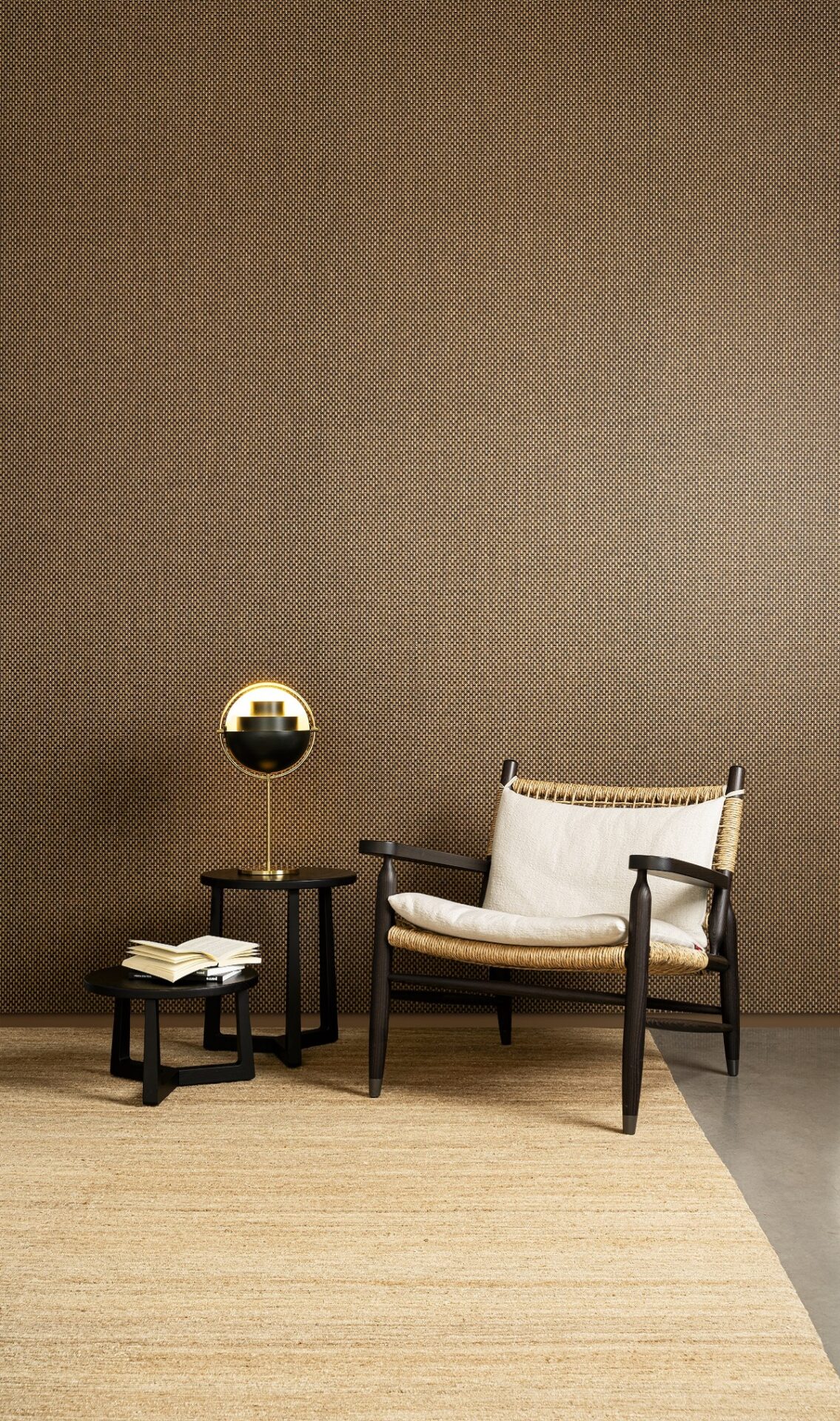 The Ruban design features narrow raffia strips glued by hand to a non-woven backing, which in turn is cut into wider strip and woven into a whole piece. Available in four colourways. Rattan is a handwoven material that creates a timeless, warm look. Thanks to the shading of the natural fibres, a nuanced shadow play of light and dark is created. This effect is enhanced by a background in cream or black. Available in two colourways. Sambe is a design made of hemp fibres whose natural colours contrast with fine black yarns. Available in five colourways. Scope is inspired by a steppe, a treeless vista, giving a soft look, making it a very versatile design. Available in five colourways.