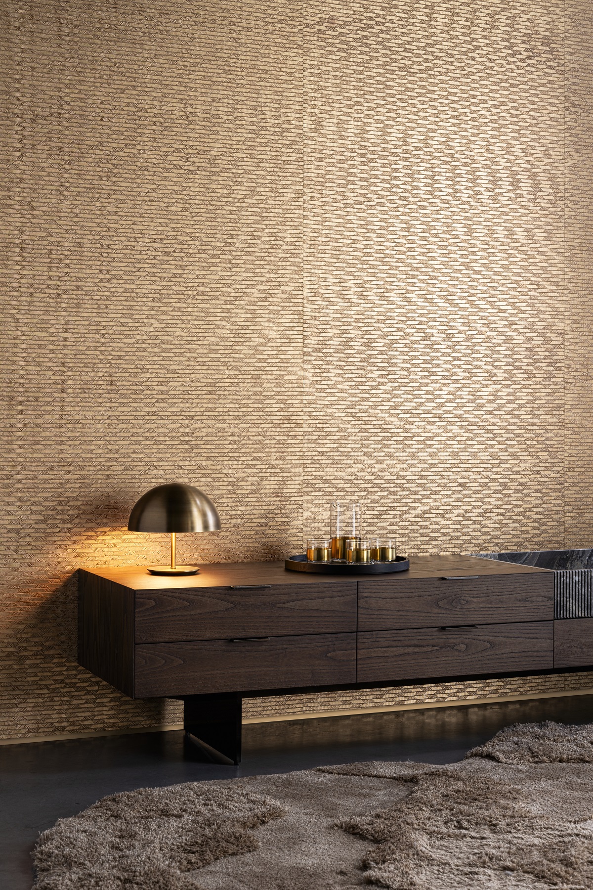 Line is a natural wallcovering that radiates peace and warmth made of sisal resulting in many natural shades. Papyrus is another traditionally-made wallcovering with hand-folded paper as an eyecatcher. The paper is patinated with metallic ink and cut into small strips. These strips are woven with a hand loom, ensuring there is no repeated pattern, making every piece genuinely unique. Available in three colourways. Raphia is a woven combination of raffia and rough threads, with an irregular texture to highlight its natural character. Both matt materials contrast beautifully with the metallic or lacquered background. Available in three colourways.