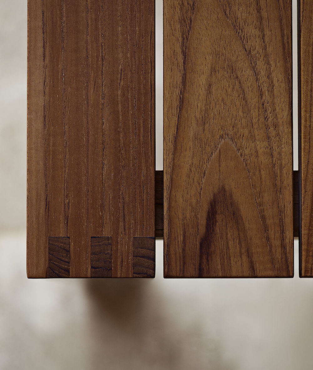 The linear form of this reassuringly robust design is constructed from durable, dark stained teak – a material which has been designed to withstand all environments and patinate beautifully with age. Slanted backrests and seats ensure maximum comfort whilst optional cushions offer additional support where needed. Upholstered in a water-resistant Sunbrella fabric, this range is perfectly suited for comfort both indoors and out.