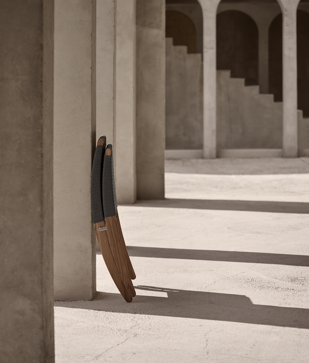 With a simple folding mechanism, this design is easily stored when not in use and effortlessly portable, ideal for utilising on balconies, terraces and transitional areas.