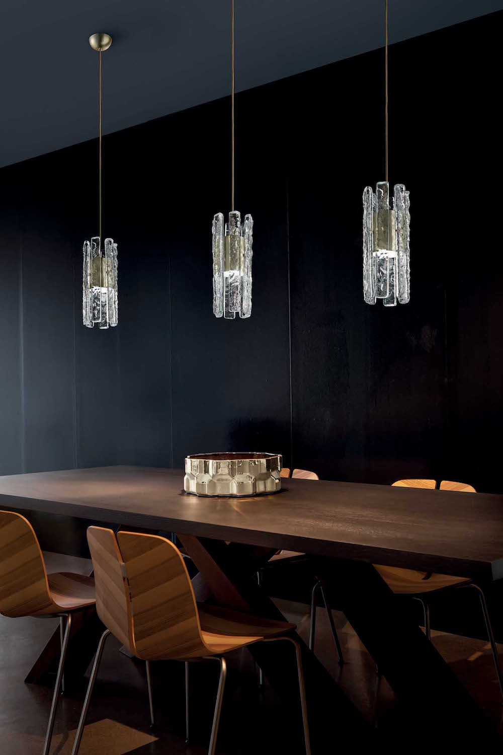 This is an opulent and refined collection. The use of soft gold and a clear textured glass succeeds in giving it the desired classical feel. The strips of glass look much like ice, but also precious and jewel-like when lit. It is sculptural and there is a sense they are suspended delicately on the exterior of the lights.