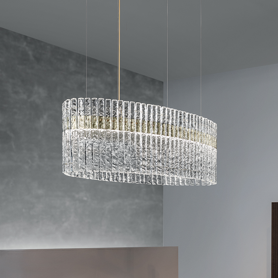 To stretch the length of dining tables or for use in billiard rooms, choose from sweeping oval shapes with vertical glass strips, or long tubular forms that run horizontally and echo the tiered drops. The collection also includes curved vertical wall lights and ceiling variations, plus an oval table lamp.