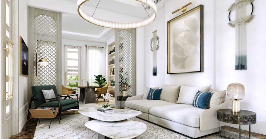 Image caption: Render of suite inside Raffles Jeddah, Kingdom of Saudi Arabia