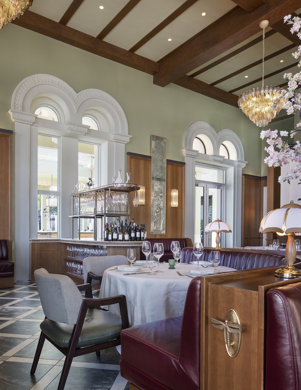 The fine dining restaurant Principessa Ristorane transports guests to lakeside dining on the shores of a northern Italian villa, bringing forth elegance, grandeur and modern touches. For this historic room Rockwell Group brought in rich jewel tones and celebrated the timber beams in the ceiling. Warm wood wainscoting lines the dining room, which has a restored original terrazzo floor. Dramatic crystal light fixtures accentuate the historic beam ceiling and add a warm glow, while sconces and mirrors reflect water views. An outdoor dining terrace and bar, adjacent to the Palm Court patio, offers uninterrupted views of Lake Boca.