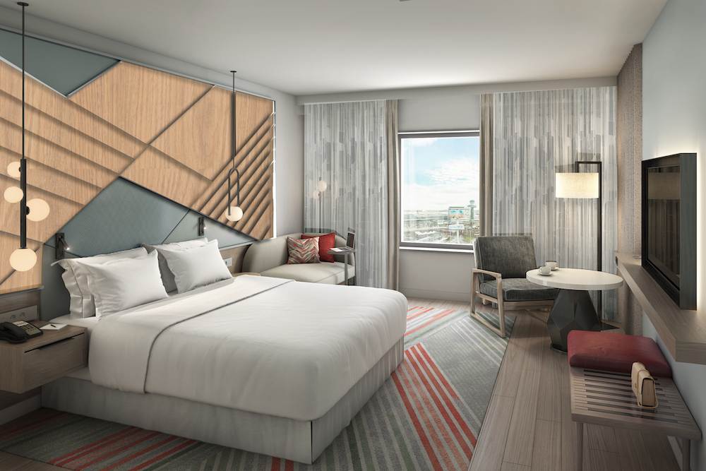 The project, which is still in motion, is a full refurbishment of the guestrooms and corridors in the airport hotel. It was integral to hit the right notes as this project is an early adopter of the new branding for Sheraton. The team were inspired by aerial views of the tulip fields and surrounding Land Art Park Buitenschot, built not only for recreations but also to reduce noise from the airfield.