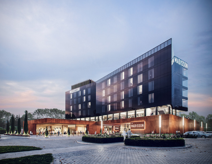 - Image caption: Exterior visualisation of ADP’s new hotel in a post-industrial community. | Image credit: ADP Architecture