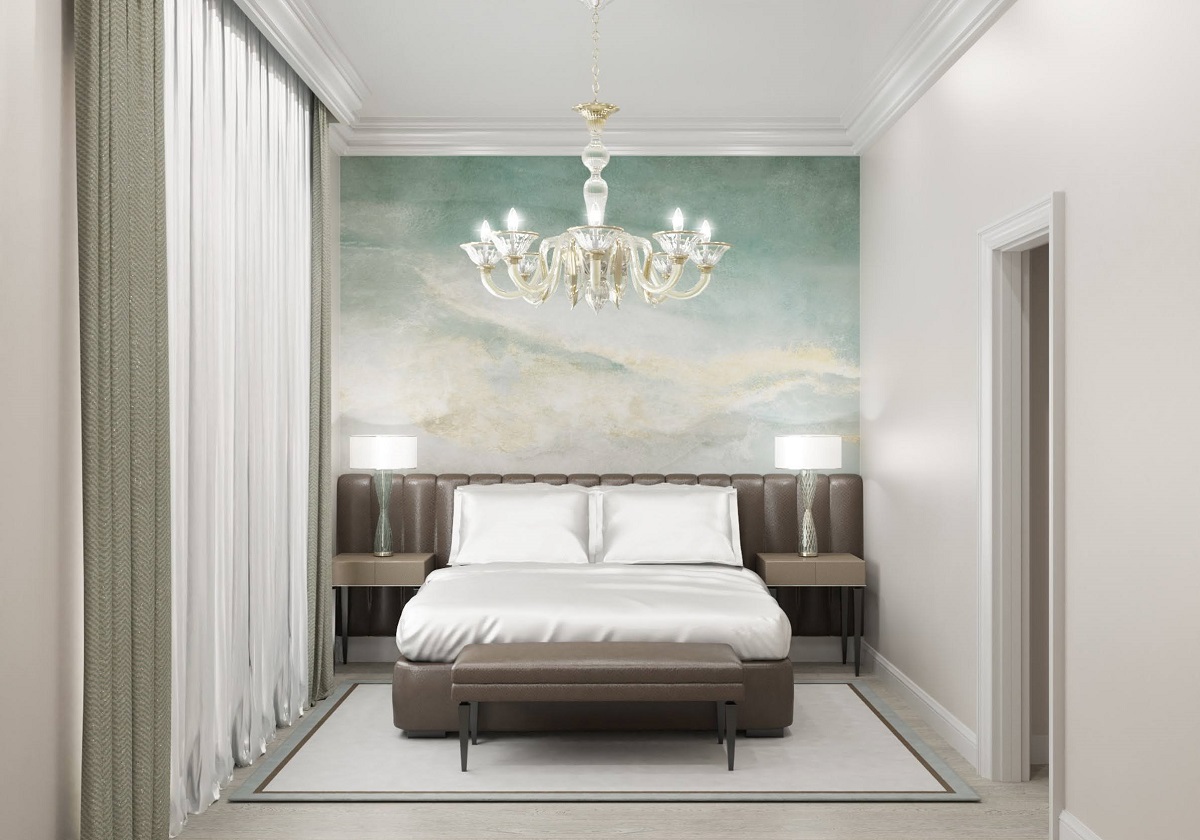 References to the city of canals appear throughout; paintings by Grecale feature touches of gold resembling those found at St. Mark’s Basilica, while table and floor lamps by Italamp make use of Venetian Murano glass.
