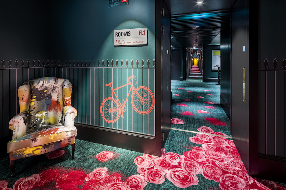 ‘London Reloaded’ was the interior design concept for nhow London. The design studio Project Orange stretched that broad theme to its limits when imagining the look and feel of the the lobby inside the 190-key hotel. Although the arrival experience is impressive and memorable, we believe that the corridors, which often become ‘dead spaces’ are a true reflection of the studio’s ability to uniquely narrate a story with interiors. Inspired by a London stroll in the park, the corridors feature detailed HD carpets by Brintons and has been brought to life with humour. Each floor, facing the lifts, features a stencil of a bike chained to a fence. As guests move up each levels of the hotel, another part of the bike is removed, which is a playful nod to the reality of most, if not all, for cyclists in the city.