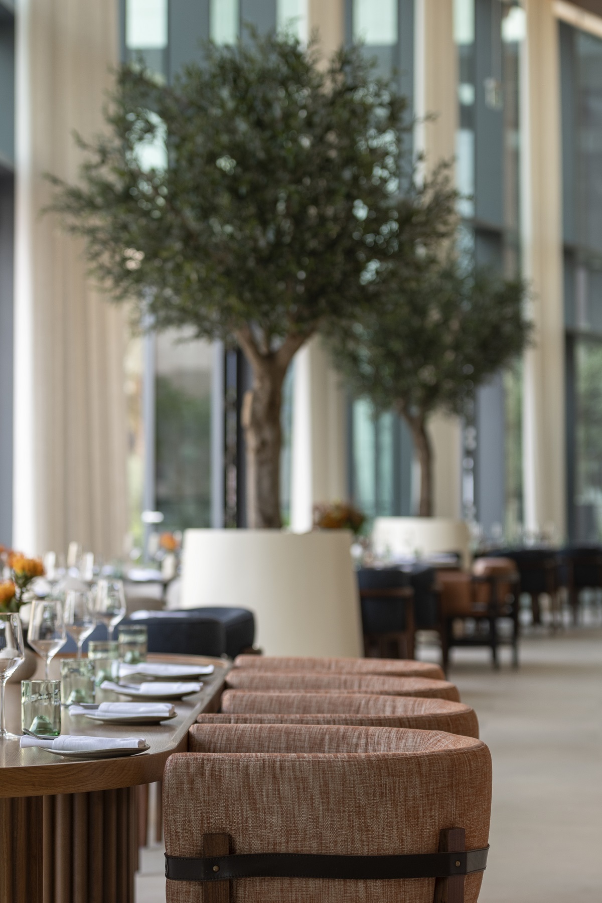 Bold pieces of FF&E layered with textures, and organic shapes take subtle inspiration from the contemporary organic lines of luxury yachts. Floor-to-ceiling shelving creates eye-catching moments with carefully curated hand-cut tiles, artwork and inspired accessories. The coffee bar wraps around the lobby lounge, which leads guests onto the open terrace overlooking the marina skyline, perfect for morning coffee, afternoon cocktails or evening nightcaps.