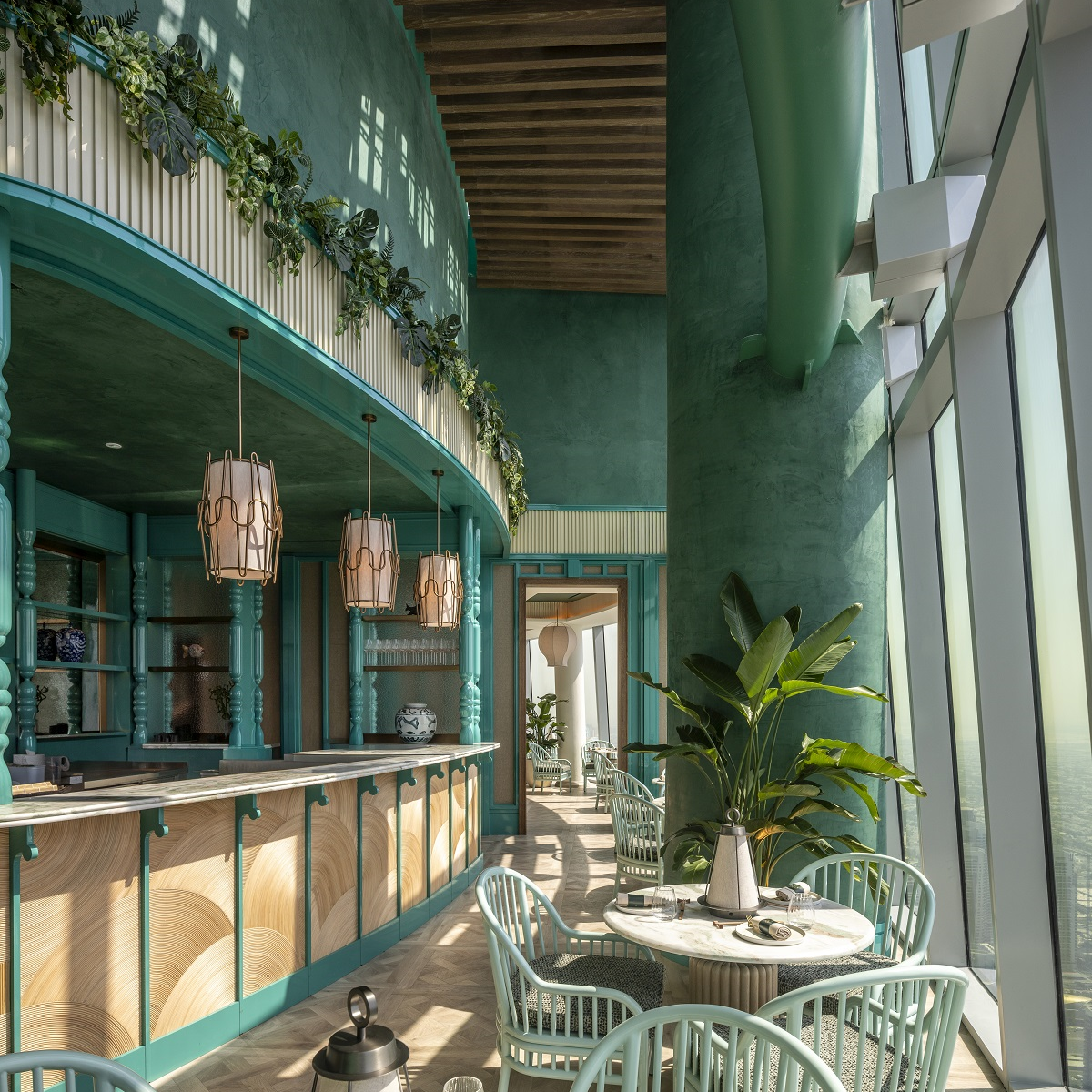 At level 76, the TATTU Sky Pool has earned the accolade of the world’s highest infinity pool. While the restaurant and bar draw inspiration from the mythical dragon, the interiors here are inspired by the elegant carp. This symbolic narrative runs through every part of the space, featuring a colour palette of aqua tones, glazed ceramics, white-washed timbers, rattan, and flowing off-white fabrics. The Japanese-fusion restaurant offers an ideal setting for daytime dining, inviting guests to relax among the clouds. The exterior design remains cohesive, with a feature cocktail bar and lounge, and a central circular DJ booth creating an energetic oasis above the clouds. The terrace is surrounded by lush planting, providing an escape from the city below.
