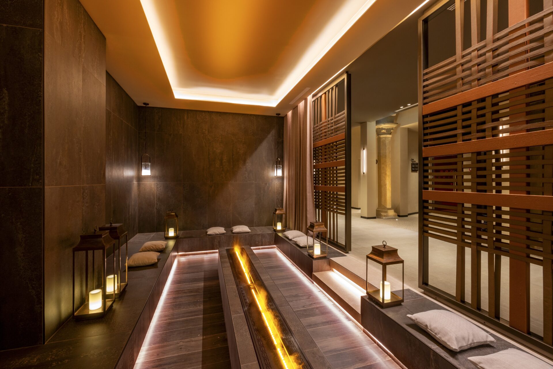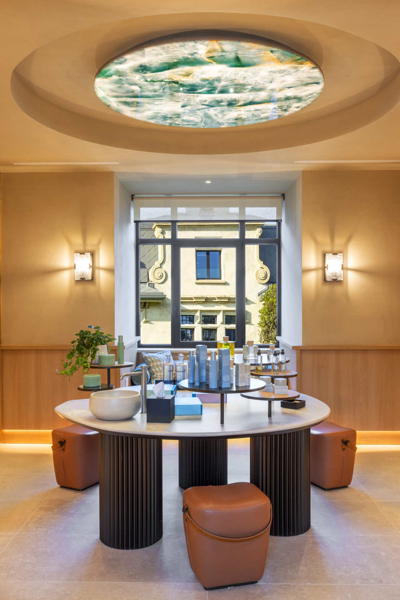 Lighting, designed bespoke by THDP, plays a vital role. Glass and iron chandeliers recall early 20th-century craftsmanship while creating dynamic plays of light. In the spa’s main atrium, Venetian glass discs hang like bubbles beneath a skylight – catching light and evoking the feeling of being submerged in natural spring water.