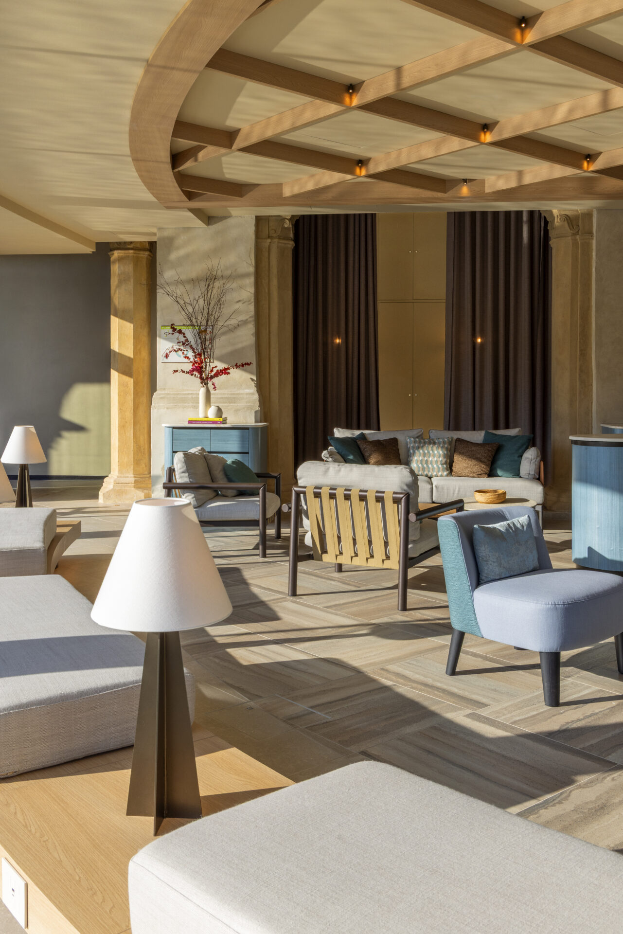 Every surface, texture, and tone tells a story. The material palette balances neutral, tactile finishes with warm accents – petrol green, deep terracotta, oxidized bronze – echoing both natural elements and historic architecture. THDP’s attention to flooring is especially notable: non-slip, large-format tiles provide grounding continuity, while intimate areas shift into richly patterned mosaics.