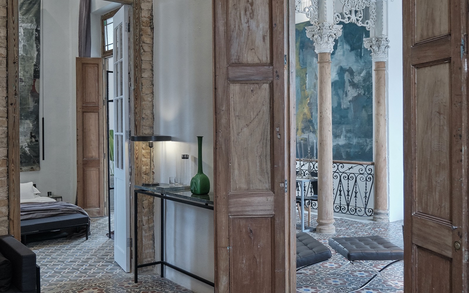 Visser’s large paintings, custom-created for each space, add dramatic flair and blend harmoniously with vintage floor tiles and Visser’s own collection of Venetian glass ornaments. The result is a minimalist, eclectic style, a space that captures Havana’s history with European touches and contemporary art – ideal for design-savvy sybarites.