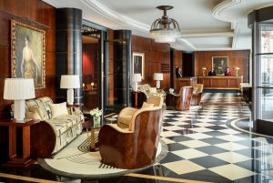 The lobby, which spans the entire front façade of the hotel, has been sensitively enhanced and given new purpose, leading in one direction to the new Magritte Bar and in the other to the concierge and reception desks. Here, a timber panelled portal has been introduced to frame the lift lobby and a grand hall which will eventually offer seamless entry into the new extension. Throughout the lobby, existing internal finishes have been revived, including the distinctive chequerboard marble floor and cherrywood panelling, while new fabrics soften the area.