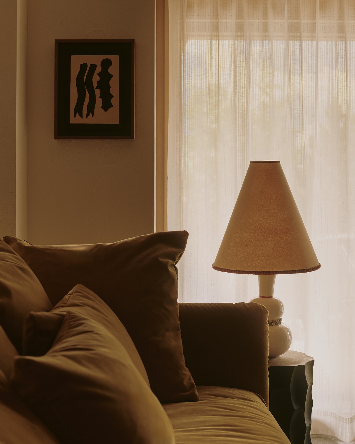 Crafted elements sourced from family businesses add maturity and soften the scene with handcrafted ceramic tableware by artist Andréa Anderson, hand knotted rugs by Layered and lighting by Grantlamp, a Valencian family design business since 1978 and oversized, handmade pendant lights by Memori Gallery in Marseille. Natural materials such as linen, leather, cotton, wool, and handcrafted double cloth weaves from Pembokeshire-based weavers Melin Tregwynt are the tempered link to easy, pared-back comfort.