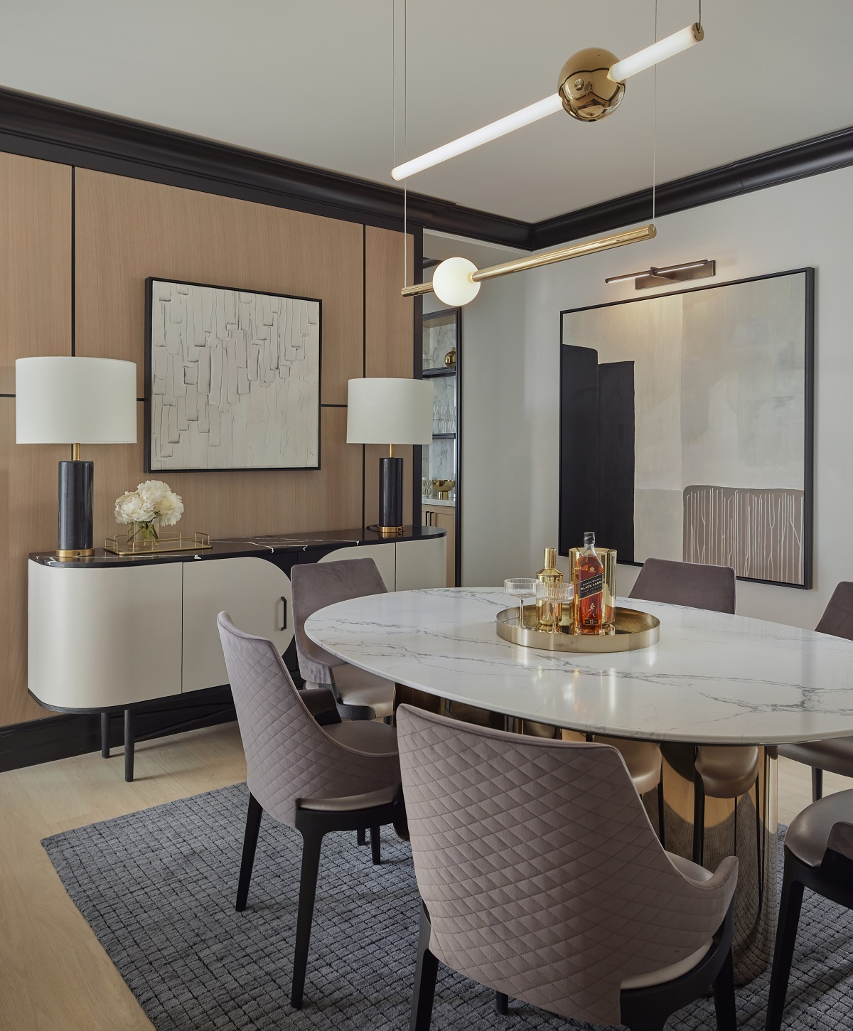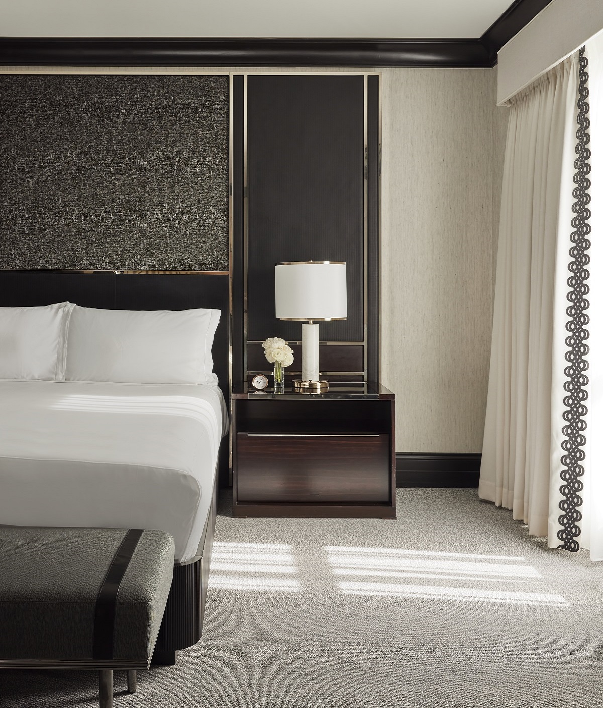 Upstairs, all of the guestrooms and suites received a contemporary design refresh, featuring a black and white colour palette with rich burgundy and blush accents. Chic pinstripes detail the furniture and drapery, as well as the framework around the architectural, floor-to-ceiling panelled headboards in the standard rooms, which integrate abstract floral art created by artist Ashley Woodson Bailey.