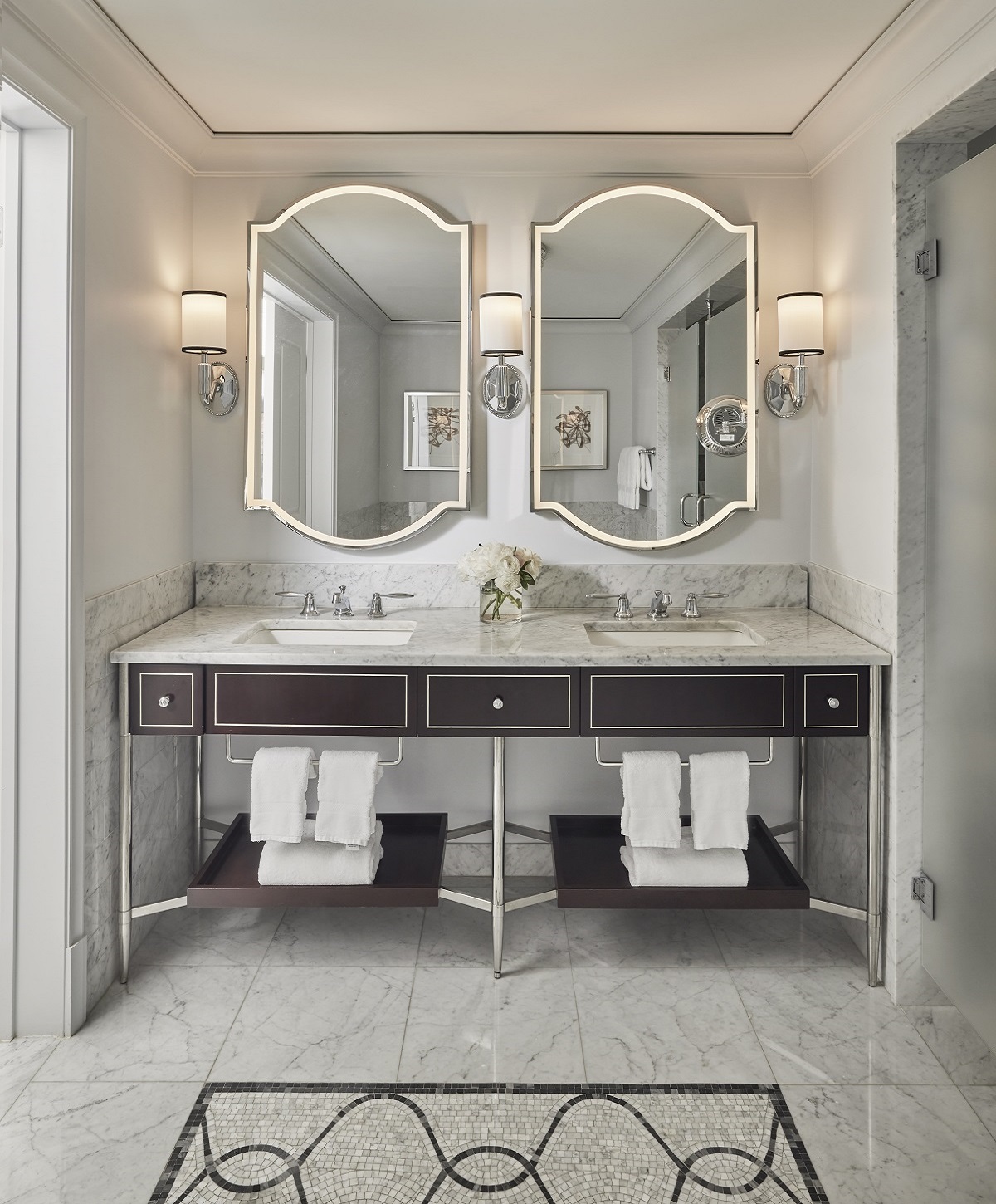 For the Waldorf, the team drew inspiration from French design masters, crediting the legendary Coco Chanel as their muse. Her influence can be seen in elements ranging from the lobby’s glittering Swarovski crystal chandelier to the black-and-white pinstriped stone that trims the entryways of two palatial new suites. The chandelier, inspired by a vintage Chanel brooch, greets guests as they step into the reimagined hotel.