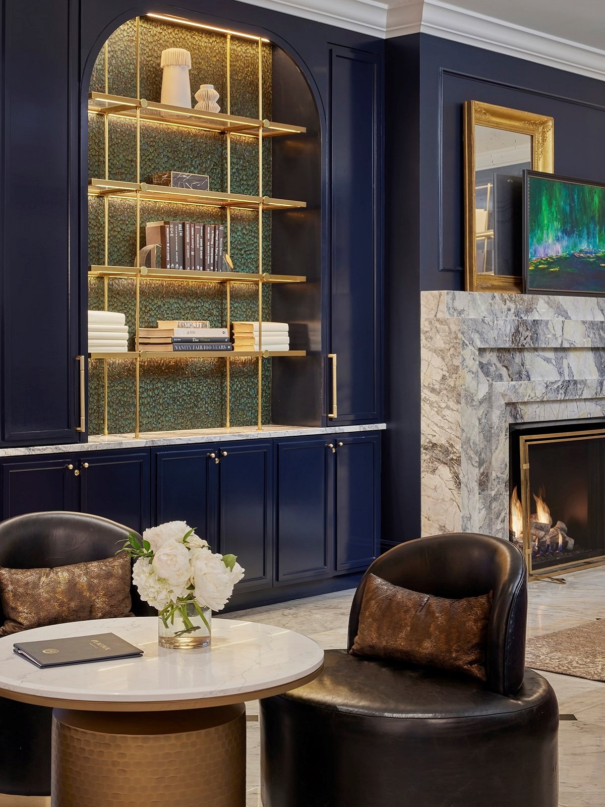 Beginning in the hotel’s open lobby, the design exudes warmth with sumptuous jewel tones juxtaposed with that opulent, attention-grabbing chandelier. The entry space flows into the Peacock Lounge, which pays tribute to the original Peacock Alley at the brand’s flagship, Waldorf Astoria New York, with peacock feather panels lining the backs of bookcase shelving. The Peacock Lounge’s noteworthy Impressionist art collection, intended to provide the essence of a formal parlour, is also worth exploring.