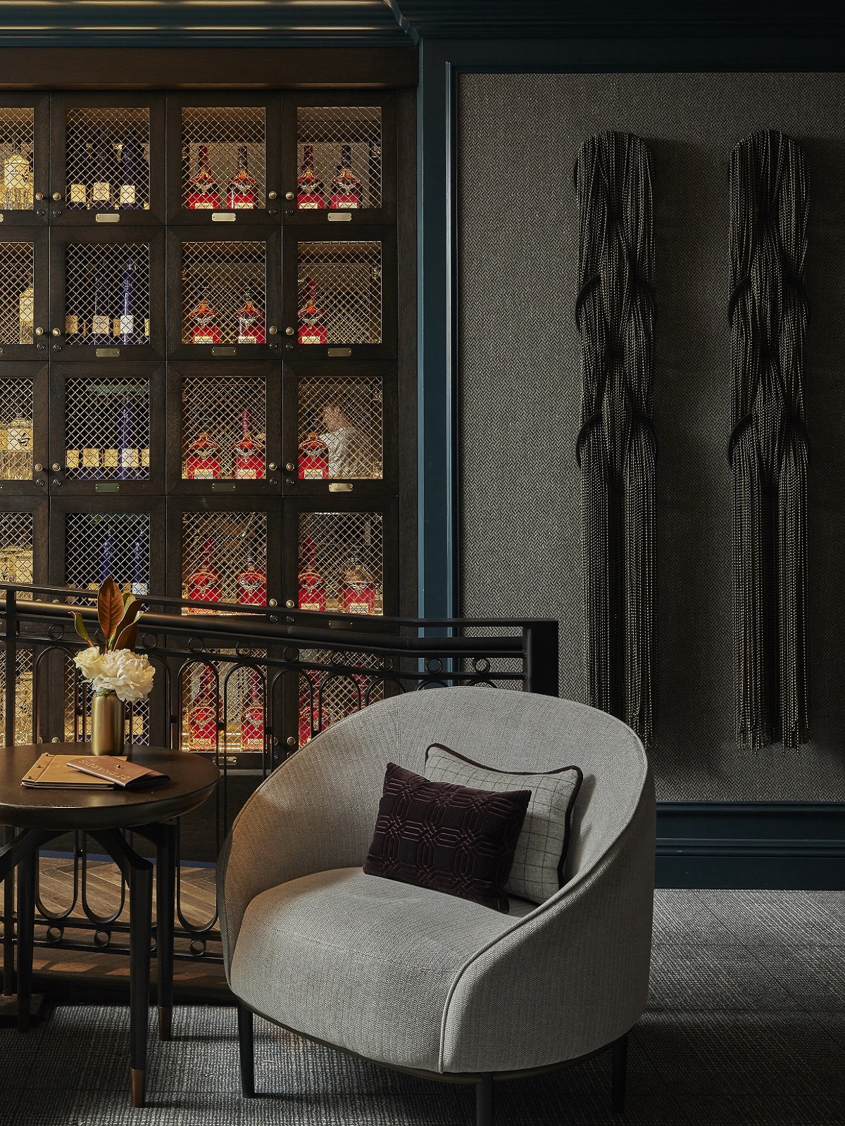 Bernard’s, the hotel’s cocktail lounge, has reopened in its former space as an intimate craft-cocktail lounge and champagne bar sanctuary, adorned in traditional tweeds and equestrian leather with brass accents. Other Scottish Highlands-inspired design elements include millwork panelling with custom herringbone-tweed inserts and cosy banquettes with leather and plaid detailing. Notably, the design team commissioned artist Kahmi, who created a three-tier braided art installation inspired by a braided horse tail. The lounge also includes a step-up bar, which overlooks the hotel’s front courtyard drive, fluted smoked-glass windows that peer down to the updated lobby and private antique brass lockers, where regulars can store their favourite spirits.