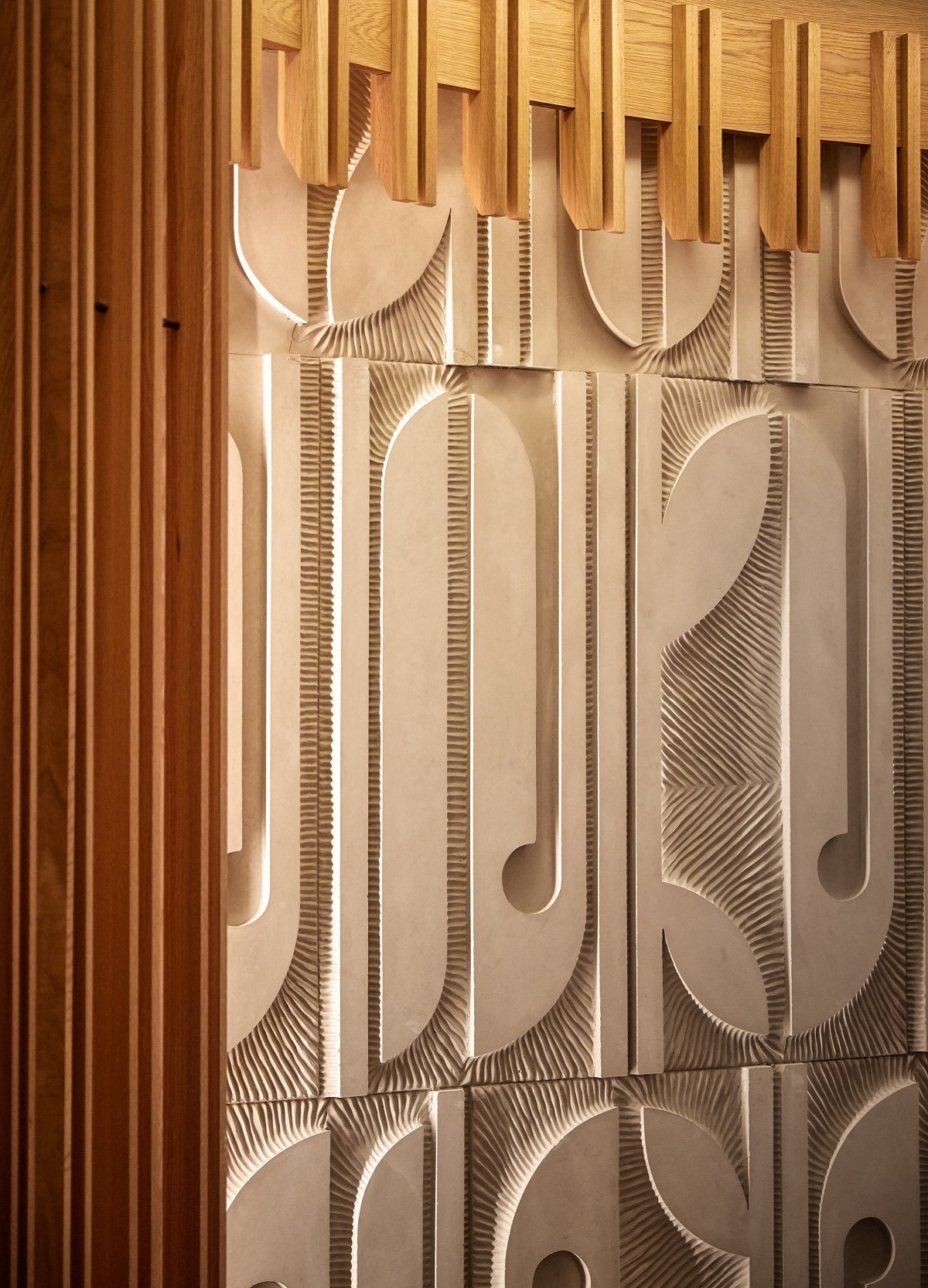 The design blends brutalist shapes with a tone-on-tone palette reflecting calm in both colour and shape. Warm oak wood screens with bronze mirror detailing; custom closet doors inspired by the building’s façade; a stone and walnut console that combines the desk, dresser and mini fridge; custom lighting; and soft custom carpets bring refined and comfortable feel to the rooms.