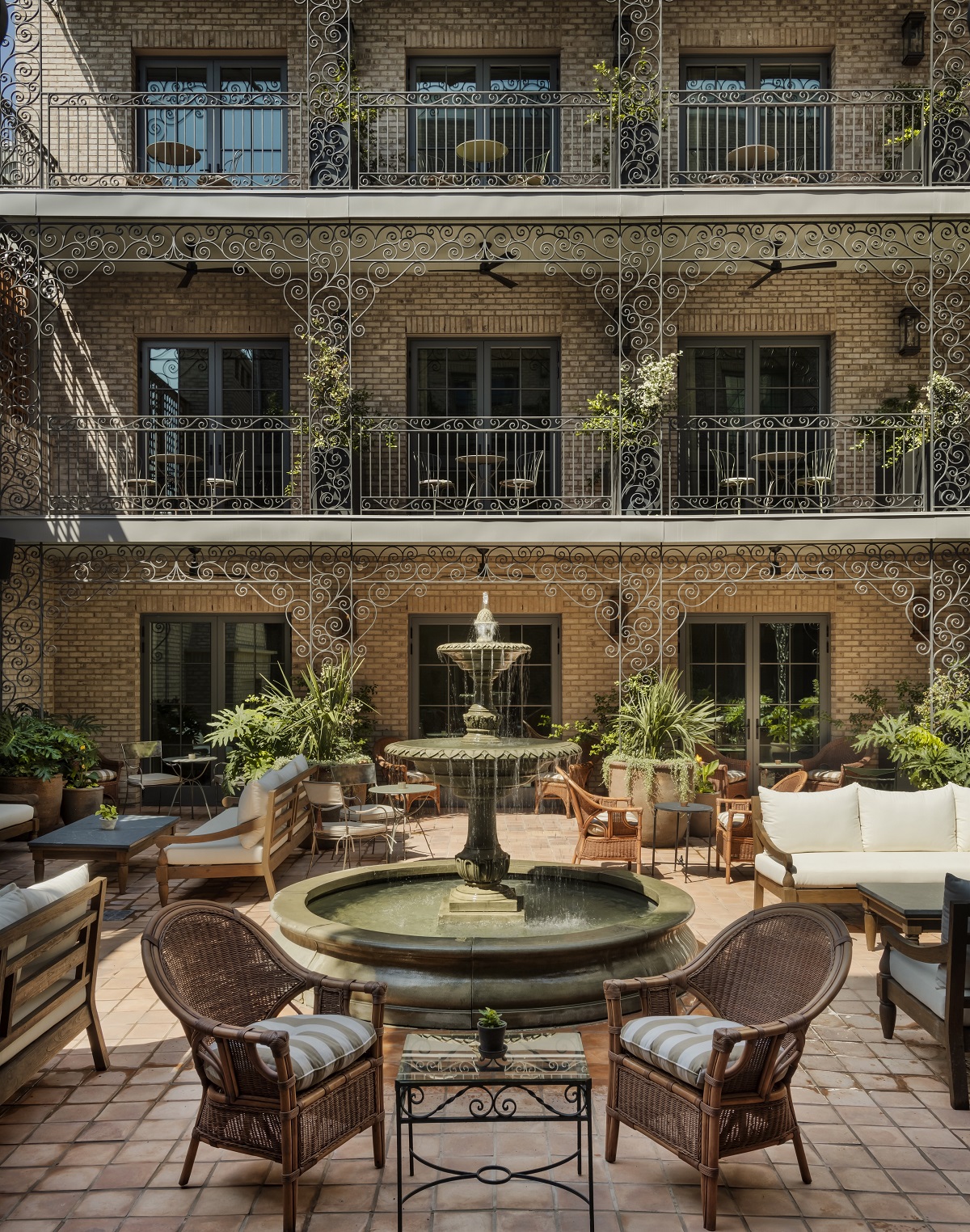 At the heart of the hotel lies the courtyard, serving as the property’s lush living room for guests to congregate. Drawing from the European influence embedded in Charleston’s architectural DNA, the courtyard features three stories of ornate wrought iron balconies, a palette of earthy terra cottas, a prominent wood-burning fireplace and a two-tiered fountain at its centre, all draped in lush greenery and bathed in soft lighting from surrounding gas copper lanterns, creating a serene sanctuary off the bustling King Street.