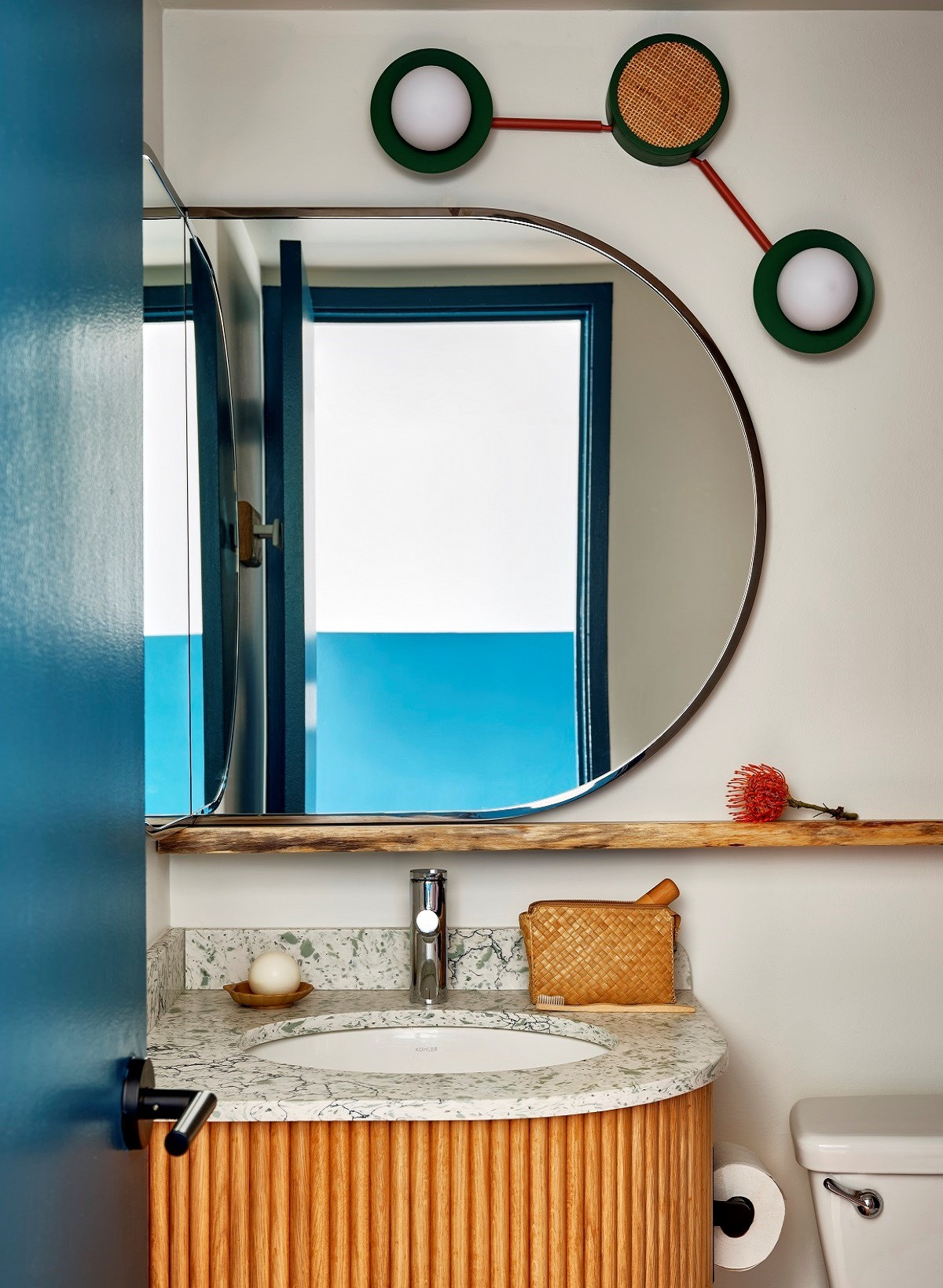 green wall with contrasting orange patterns on the headboard in Wayfinder Waikiki guestroom