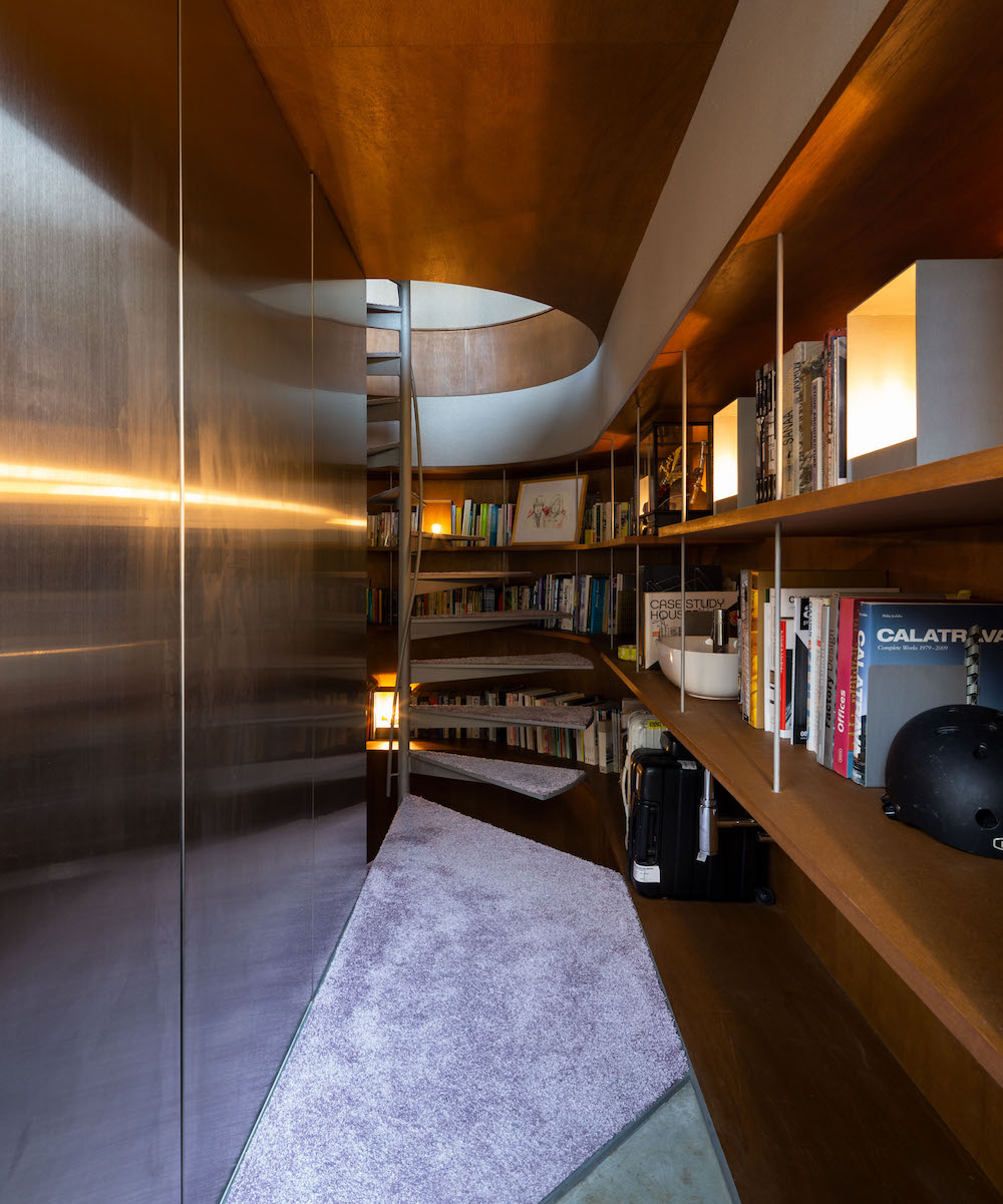 The different floors are connected by a spiral staircase. Takaaki Fuji + Yuko Fuji selected materials such as wood, cork, and certain types of paint – materials with their own unique character that develop and flourish over time.