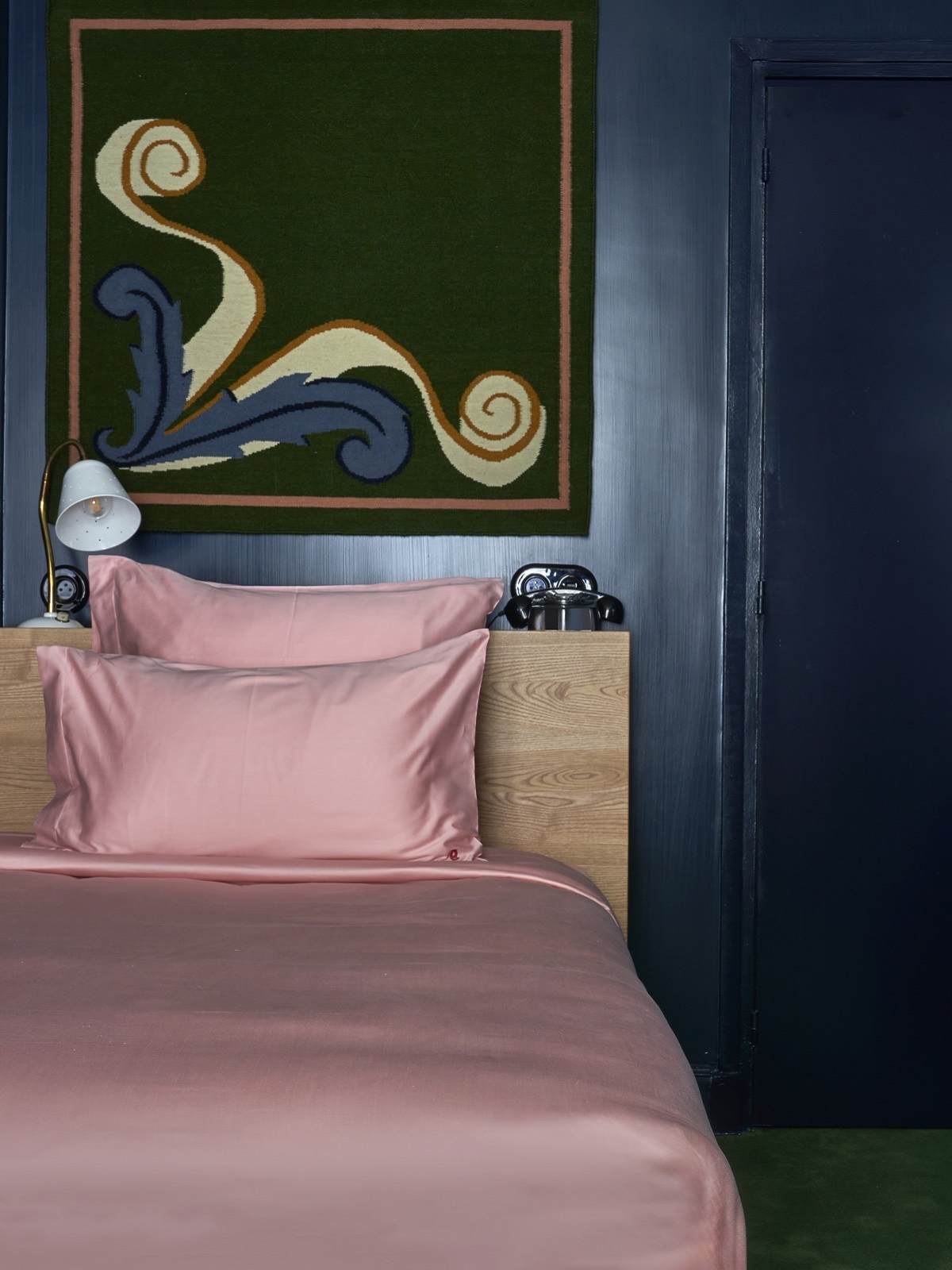 On the ground floor, the lobby leads to a theatrical lounge room in silver wallpaper which provides the perfect setting for working or a quiet drink in the evening – where the movements of passers-by on the street are reflected dreamily on the shimmery walls. Grassy green carpets run throughout the hotel to make things ‘pop’, meanwhile the guestrooms are divided into three schemes, starting with a moody, glossy blue, moving through shades of brown and ending on a light, airy blue across the top two floors.