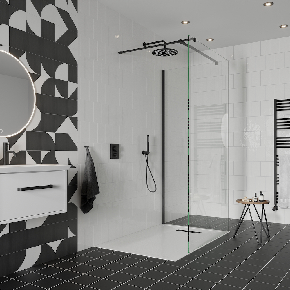 - Image caption: GALLERY 10 matt black glass corner shower. | Image credit: Crosswater