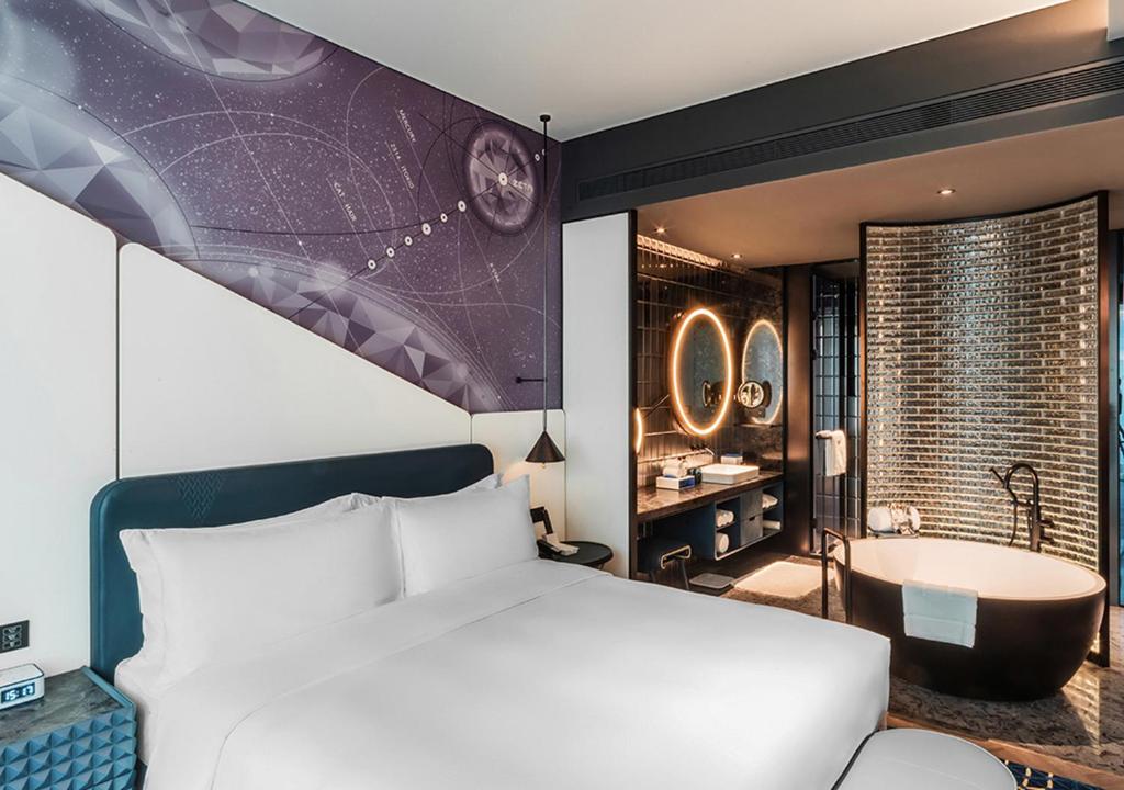 The hotel’s 345 guestrooms and suites offers modern luxuries and new-tech conveniences, with walls depicting planets, constellations, and discovery of the nebulae through a “meow eye cabin” LED screen emulating space exploration. From 26th floor to the highest floor on 28th, the triple-story Extreme – WOW Suite (the brand’s take on the presidential suite) incorporates more than 1,000 square meters of living and leisure space, including a private garden and a swimming pool, to make for a brilliant venue for private events amplified by the hotel’s signature service.