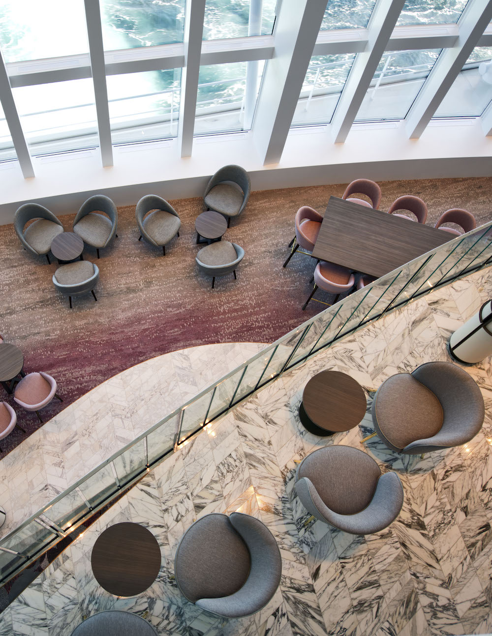 The award-winning interior design and architecture studio, Jestico + Whiles, which recently took part in a panel discussion on the new era of lifestyle at Hotel Designs LIVE, has designed most of the food and beverage spaces throughout the ship and the most spectacular space of all, the soaring triple-height Grand Atrium which captures unprecedented panoramic views across the ever-changing seascape, as far as the horizon.