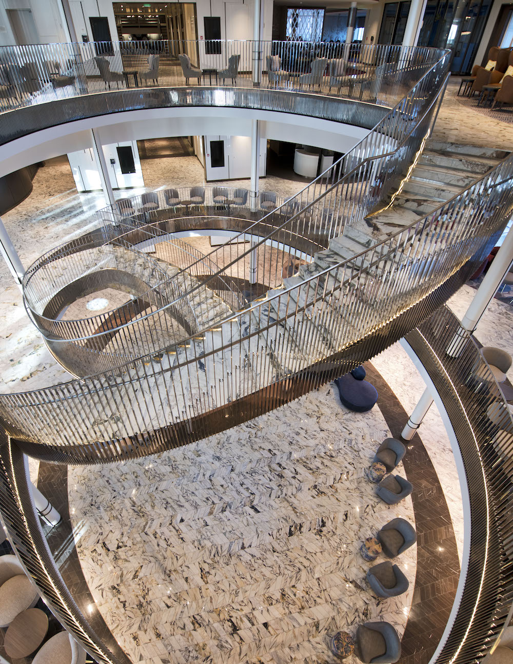 An elegant, gravity defying, arcing staircase of Italian marble with a filigree, bright silver serpentine balustrade serves as the centre piece to the space, evoking the glamour of the iconic cruise ships of the early 20th century. Designed as a sculpture, its swooping form leads guests on a journey through the decks offering ever changing views.