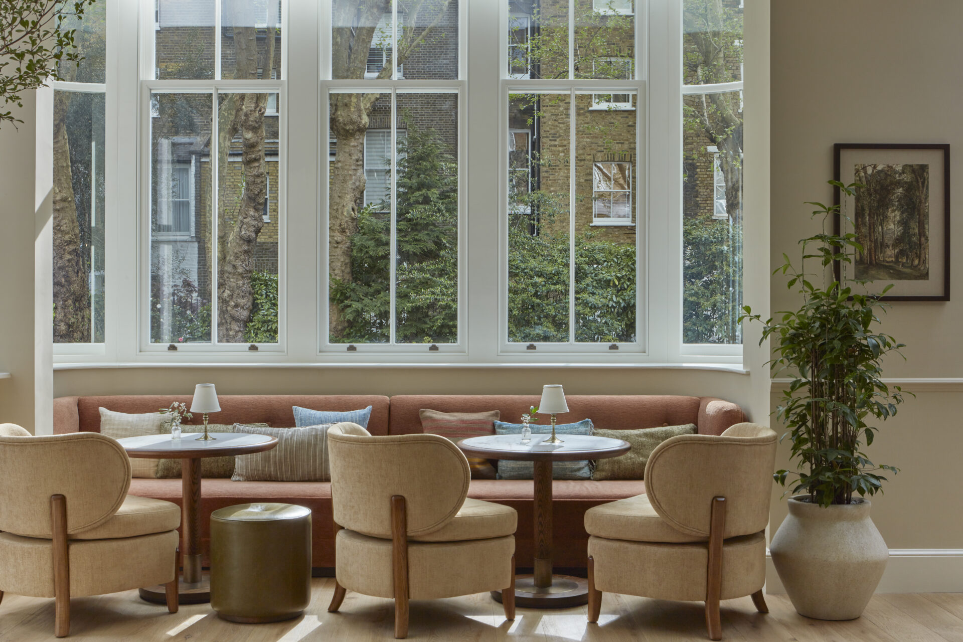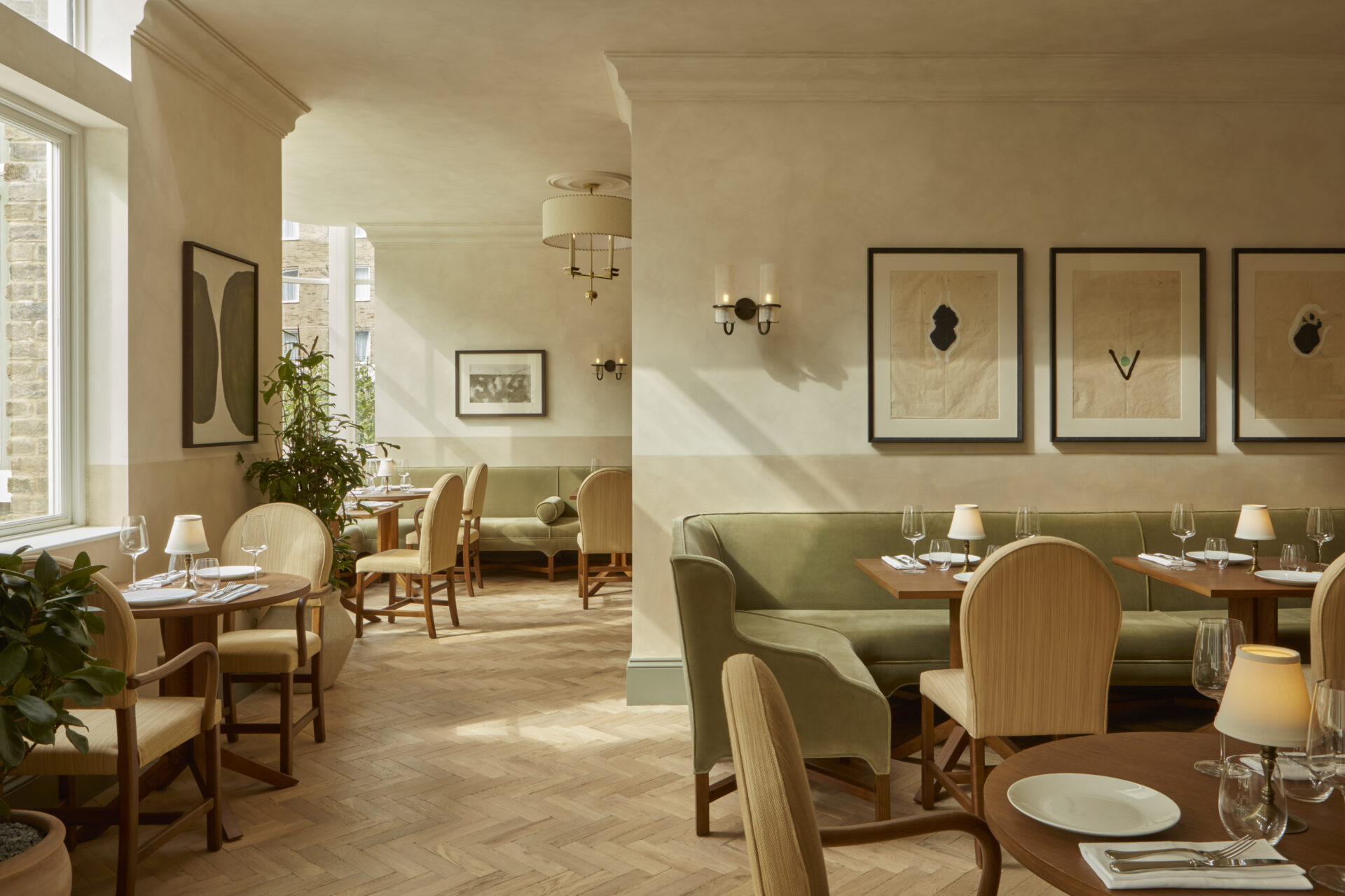 Pip’s, meanwhile, opens directly onto the street – a deliberate move to welcome in the Earl’s Court neighbourhood. With fluted glass, weathered timber, and a warm palette of biscuit and blush, the space reads as a love letter to vintage London cafés, reimagined through a contemporary lens. By day, it is croissants, coffee or fresh mint tea; by evening, a slower kind of casual dining, where locals blend with guests.