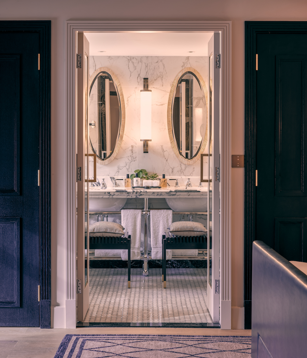 On the other side of the suite – past the corridor which features a relaxing workstation and dressing area – is a large marble-tiled bathroom, which naturally evokes a sense of calm and features a deep freestanding bath and a separate shower enclosure. “The layout we could achieve meant we had a fabulous bathing experience with the roll top bath, double vanity and huge walk in shower,” adds Littlefair. With demands elevated around how wellness is offered within hospitality, it is reassuring to see that the design team specified high quality products, such as hansgrohe showers, AXOR fittings, Roca toilets, Geberit flush plates and Kohler his-and-hers vanity sinks.