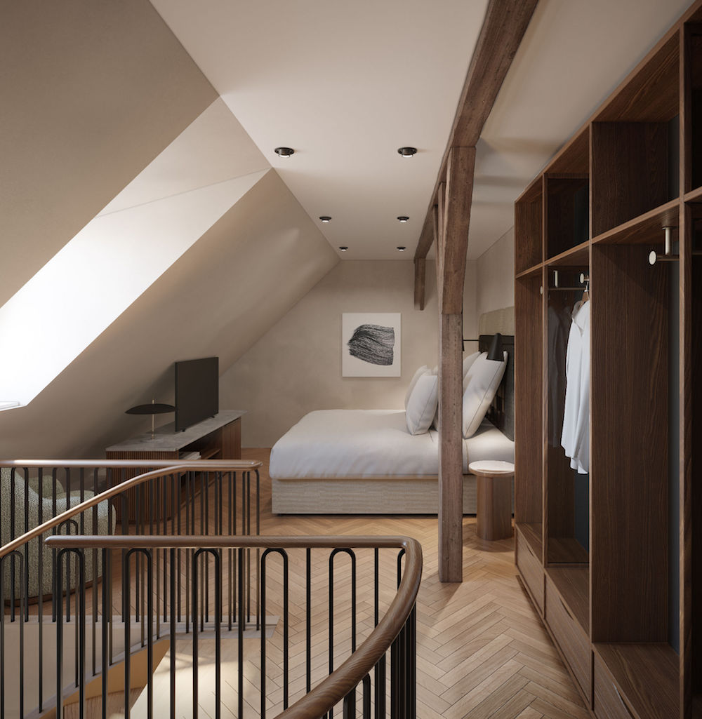 Each of the rooms has its own typography – there are 50 in total – with sprawling four metre-high ceilings on the lower levels and near floor-to-ceiling windows that give you various views of the city surrounds. The converted attic, with its exposed timber beams, differs only because of its unique character and obvious height limitations – but its roof-lit views of the city more than compensate for this.