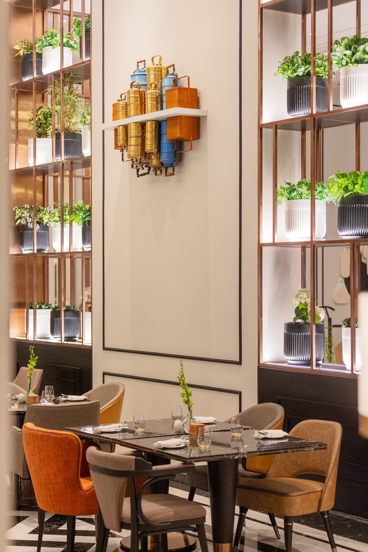 The storytelling continues at The Merchants (the hotel’s all-day dining restaurant) where the city’s legendary dabbawala system (a century-old network delivering home-cooked meals across the city) are proudly showcased through decor and art. For a more intimate expression of the design, Madeleine de Proust (tea lounge) is worth a brief pause. Its botanical artworks and muted palette reflect a quieter interpretation of the era, tastefully contrasting with the speed and drama of the public spaces.